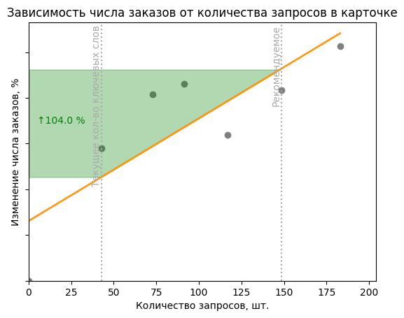 - Сейчас в карточке 43 ключевых запросов категории. Оптимизация приведет к показам по новым ключевым запросам и, возможно, росту выручки до 103%.