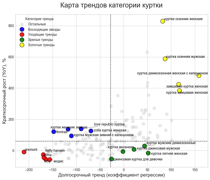 Карта трендов - это визуальный анализ популярности поисковых запросов в категории “Куртки” за последние два года.