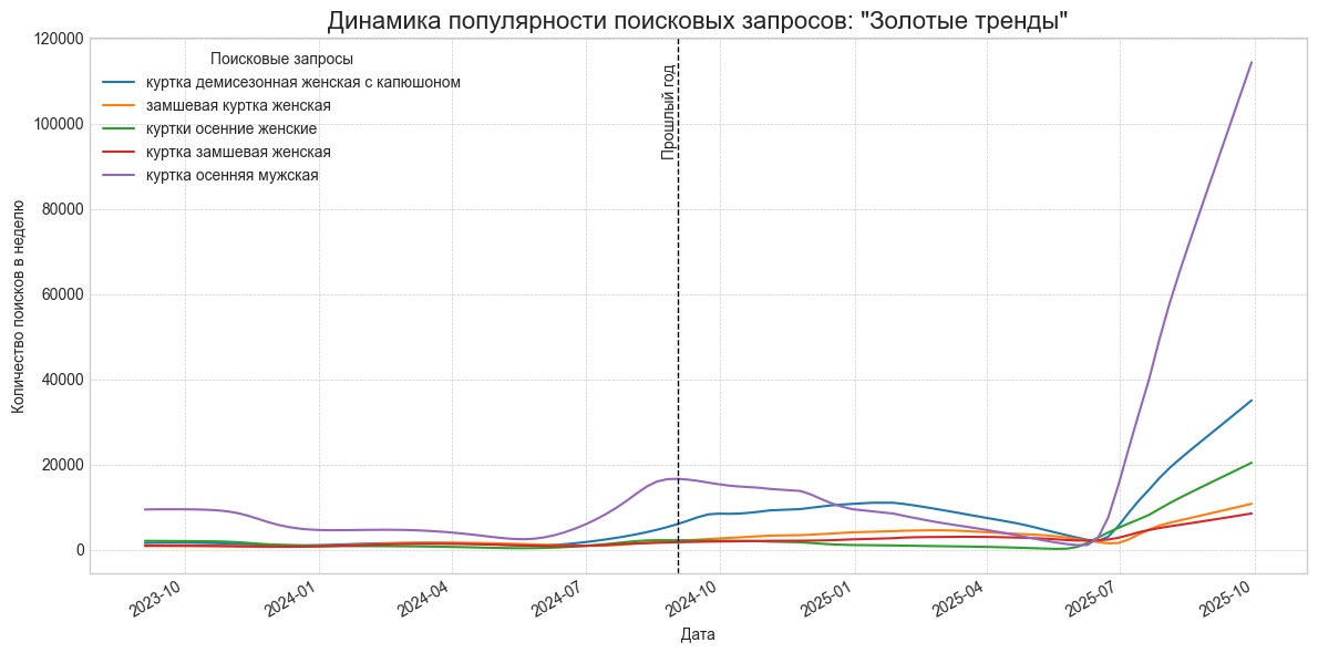 Вывод: Спрос на эти товары сохраняется, но он не показывает роста. Вложения в их активное продвижение могут быть менее эффективны по сравнению с категориями «Золотых трендов».