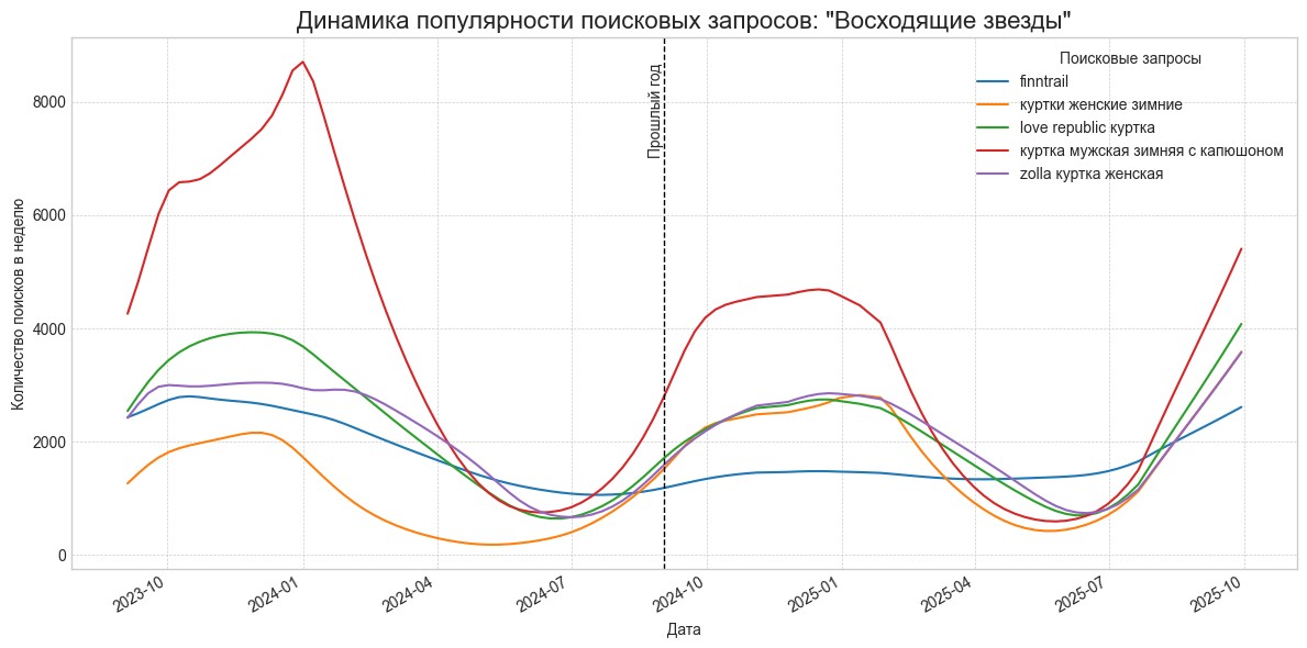 - Возрождение интереса к классике: «Стеганая куртка женская» и «куртка мужская кожаная» показывают признаки роста популярности.