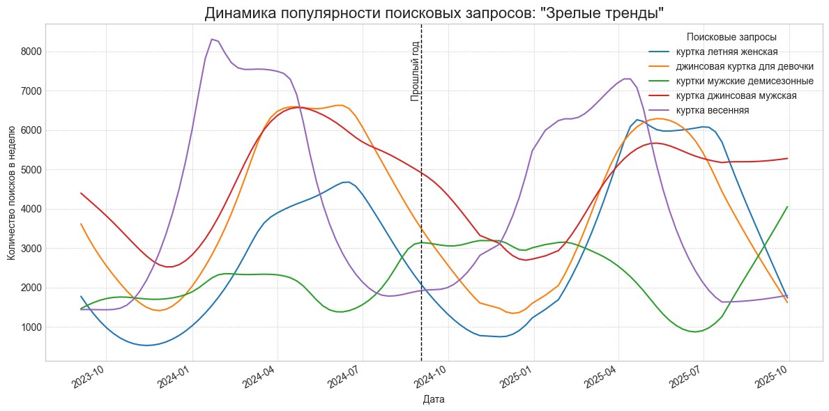 - Спад популярности джинсовых курток. Запросы, связанные с джинсовыми куртками и джинсовками, в основном находятся в категориях «Зрелые» и «Уходящие» тренды. Пик их популярности прошел.