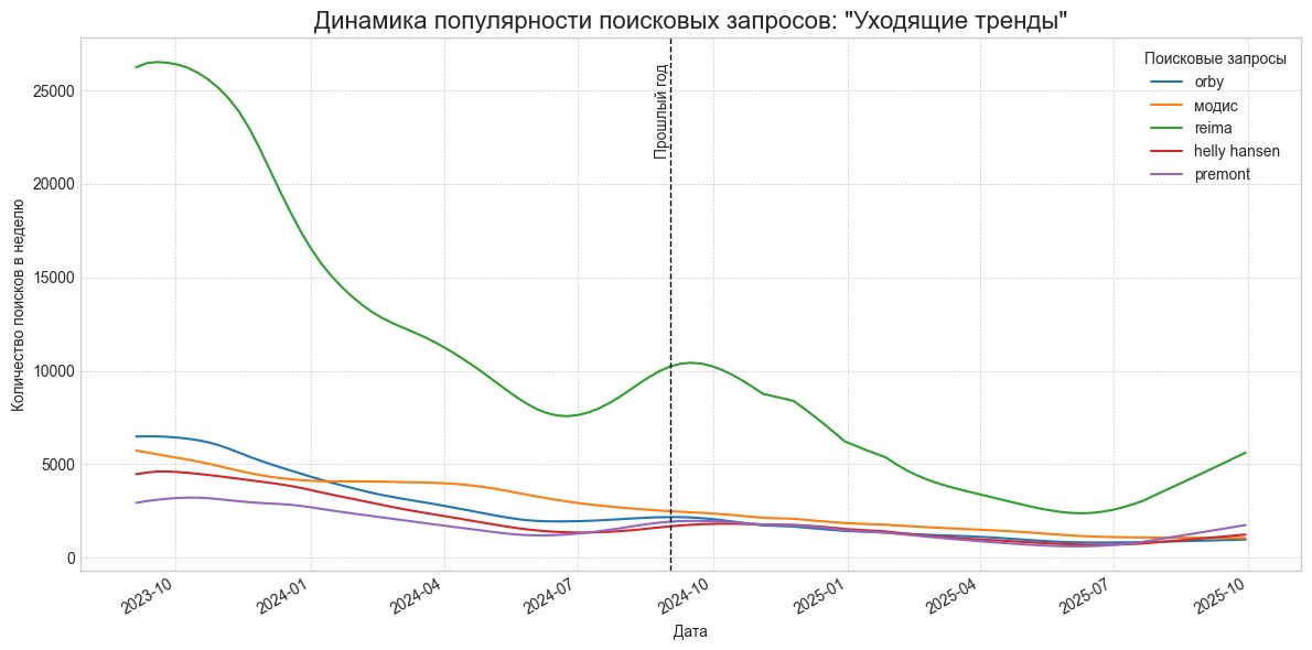 - Снижение влияния брендов. В категории «Уходящие тренды» много брендовых запросов (Reima, Helly Hansen, The North Face и т.д.). Это указывает на то, что покупатели всё чаще ищут вещь по её характеристикам (сезон, материал, фасон), отдавая им приоритет перед названием бренда.