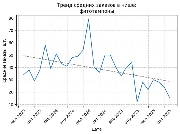 За год произошло значительное снижение средних продаж в нише на 24%.