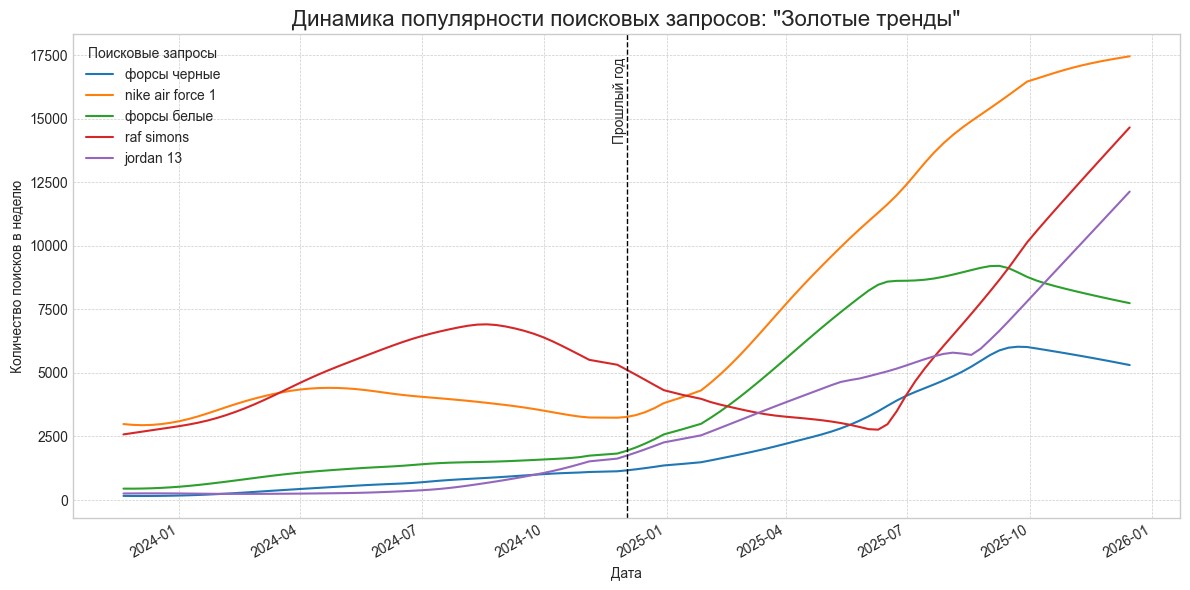 В то время как общие запросы типа «кроссовки для бега» падают, бренд Asics показывает уверенный рост в золотых трендах.