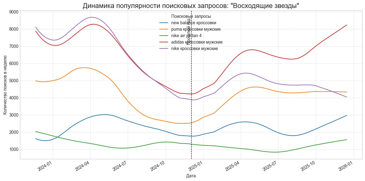 - Растут: «Кроссовки мужские/женские демисезонные», «Зимние кроссовки женские с мехом» (рост 185% в золотых и 420% в восходящих!), «Кроссовки мужские кожаные».