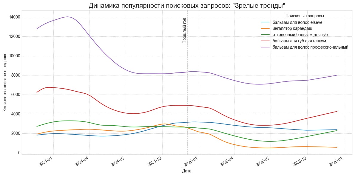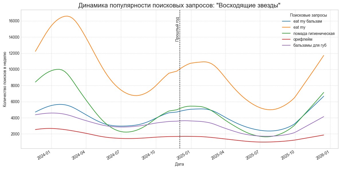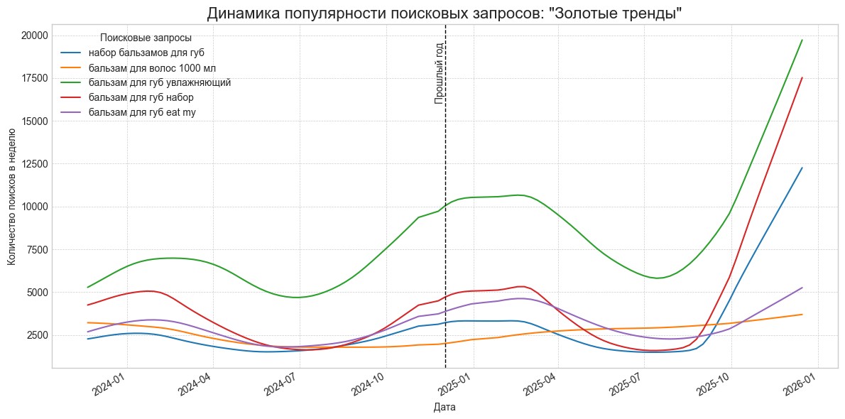 Это самый мощный инсайт из данных. Запрос «набор бальзамов для губ» показывает колоссальный рост (более 280%).