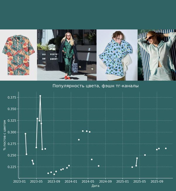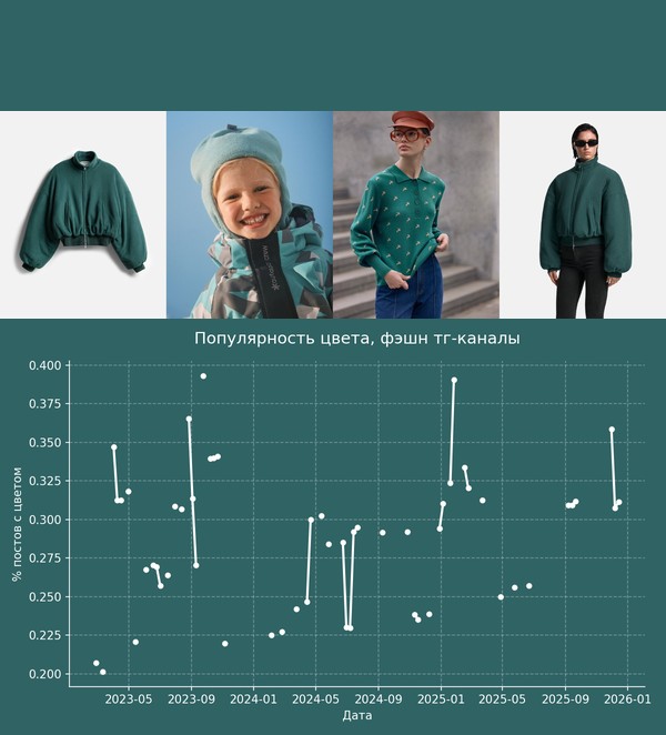 Видно, что популярность этого цвета за последние годы по всей одежде стабильно снижается. Но по некоторым категориям - растет (хотя данных мало).