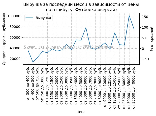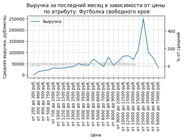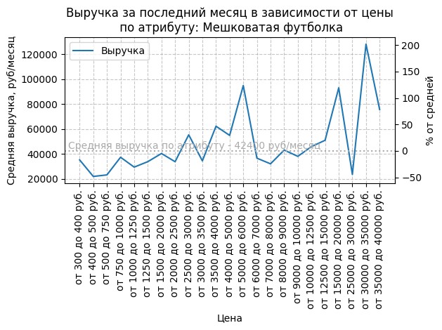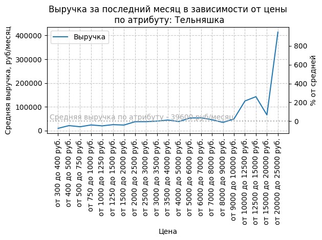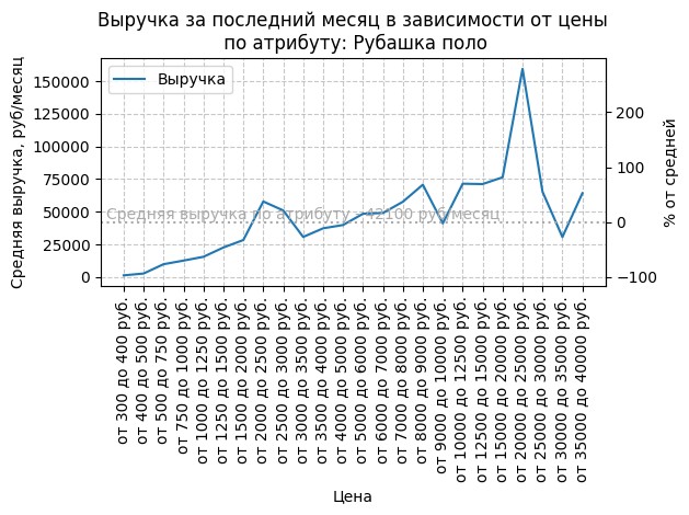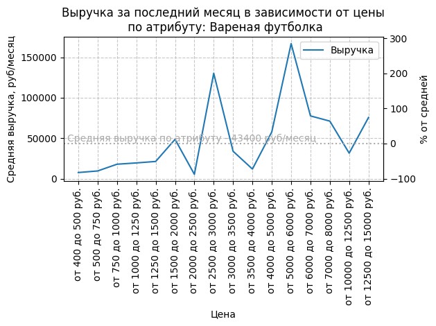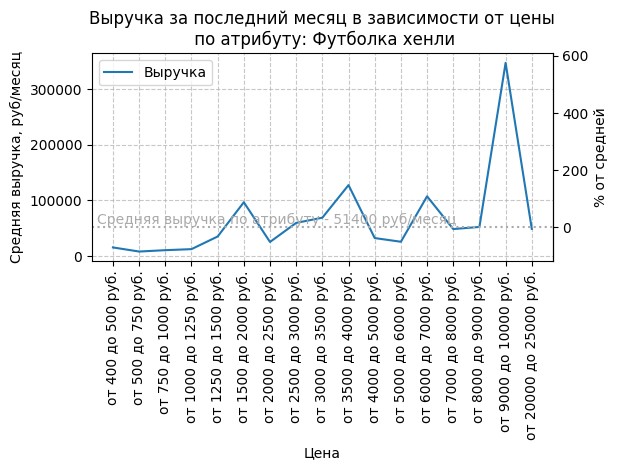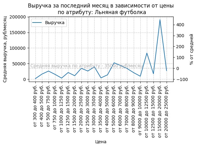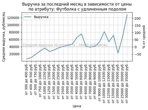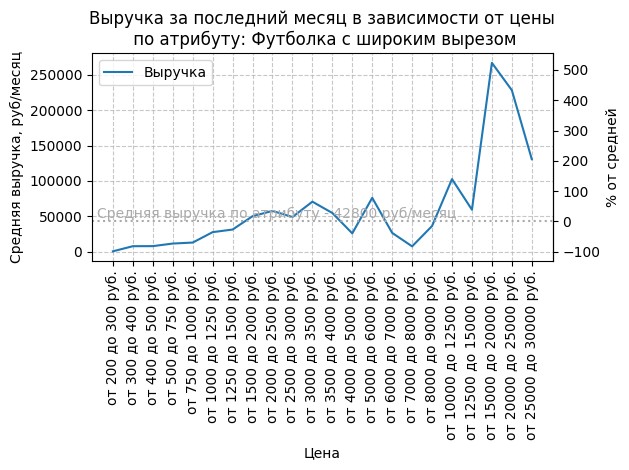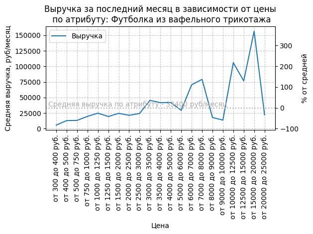 Средняя выручка (по заказам) по атрибуту - 35100 руб./месяц. Максимальная выручка 144100 руб./месяц, на 310% больше среднего по атрибуту, была при цене от 9000 до 10000 руб. руб.
