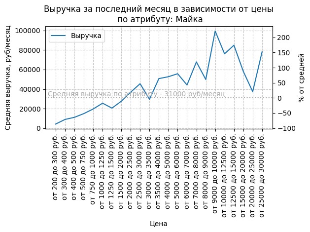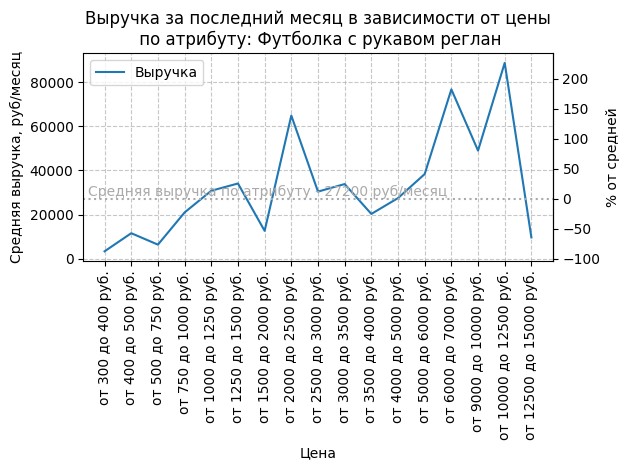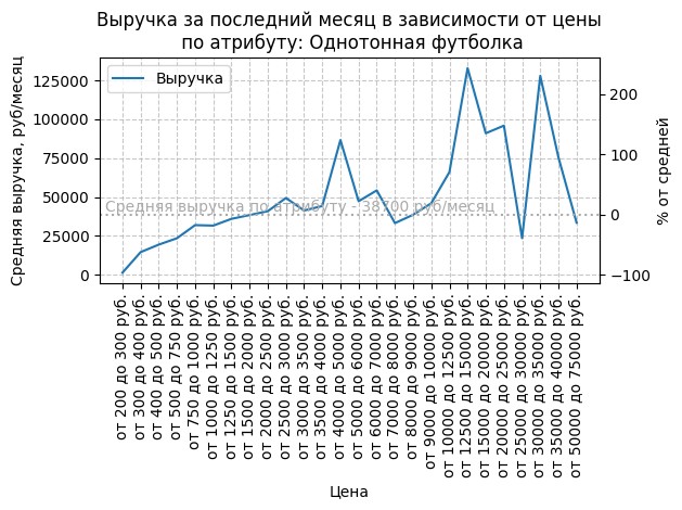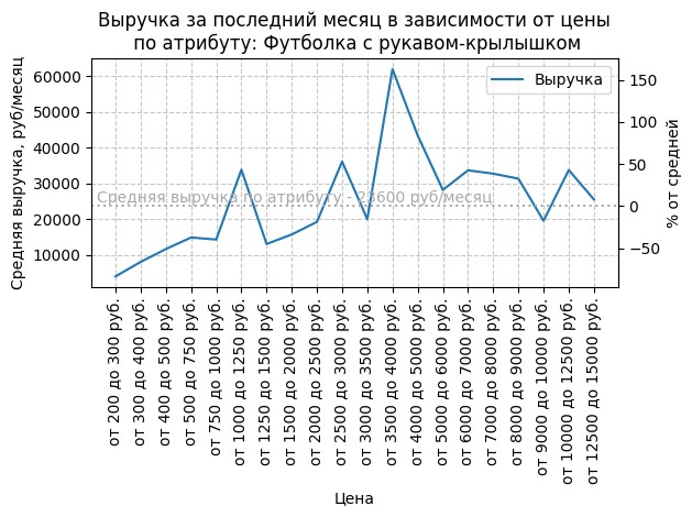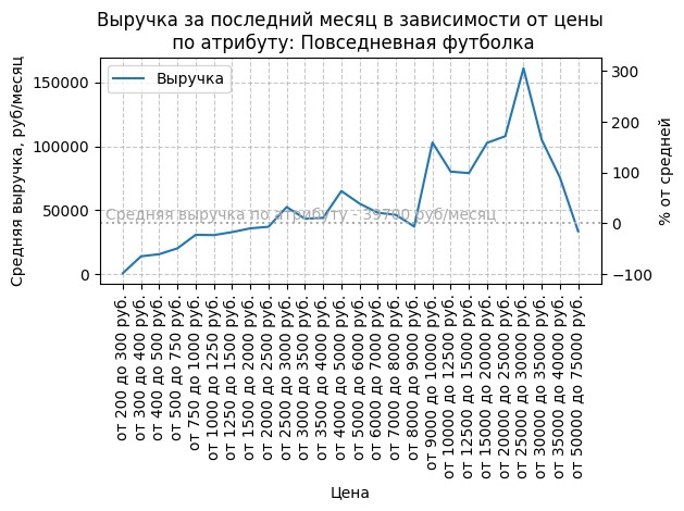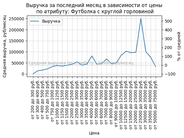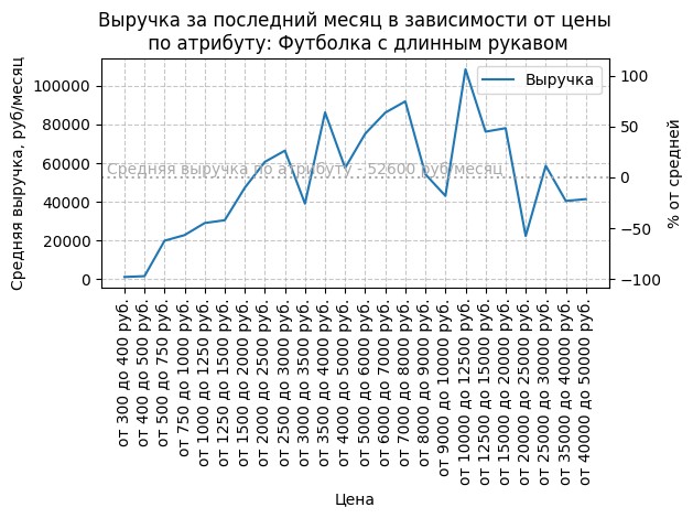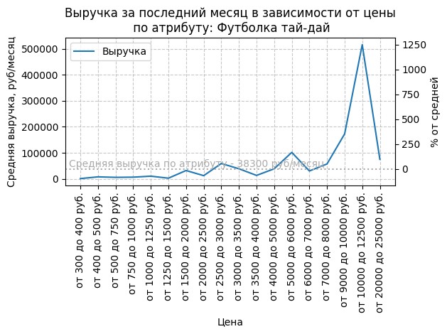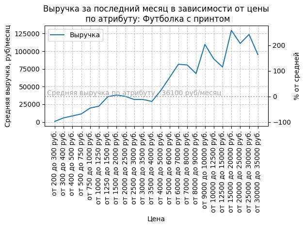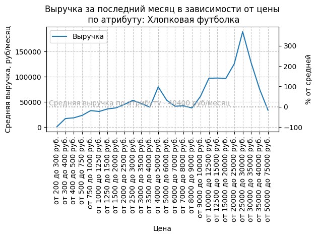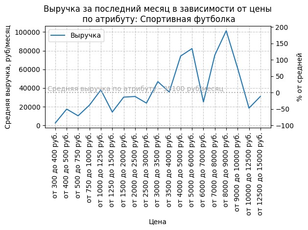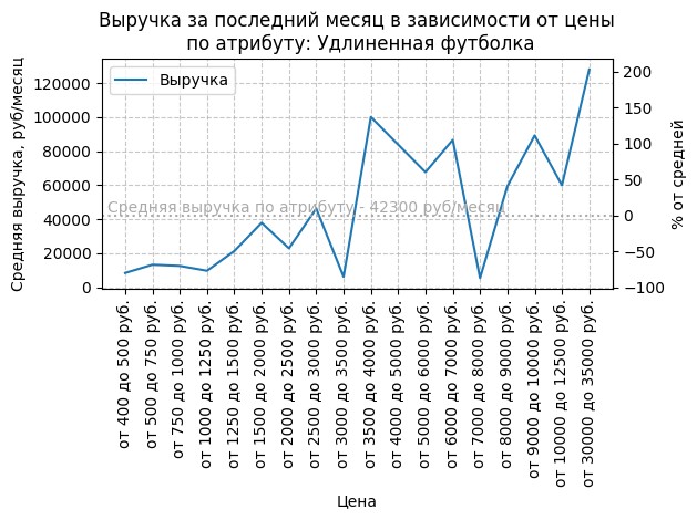 Средняя выручка (по заказам) по атрибуту - 35100 руб./месяц. Максимальная выручка 144100 руб./месяц, на 310% больше среднего по атрибуту, была при цене от 9000 до 10000 руб. руб.