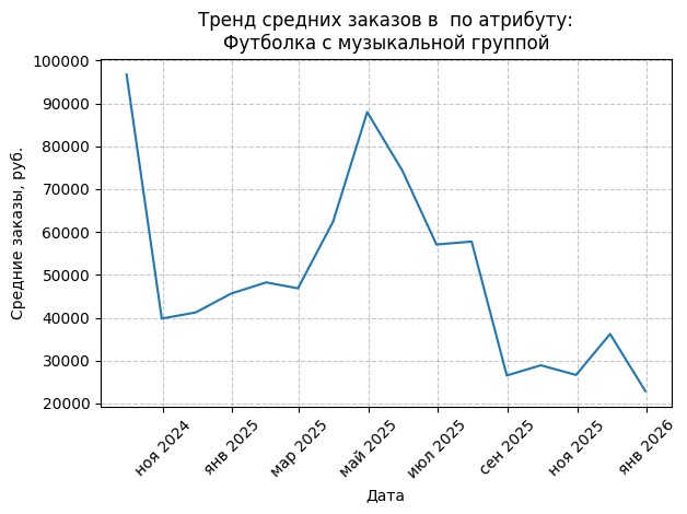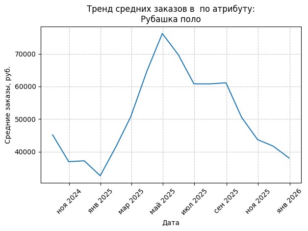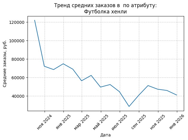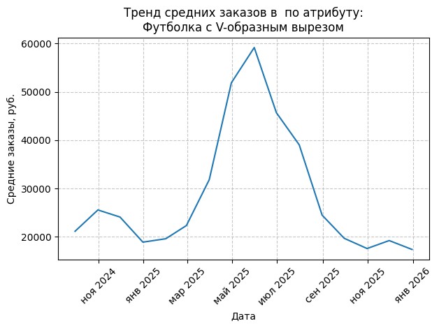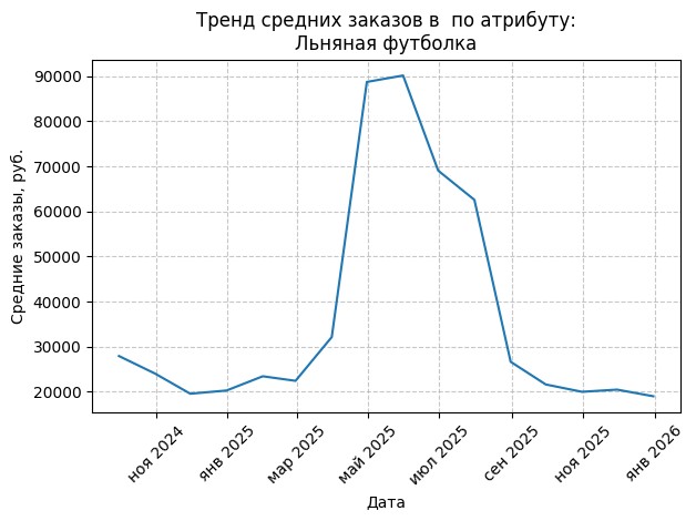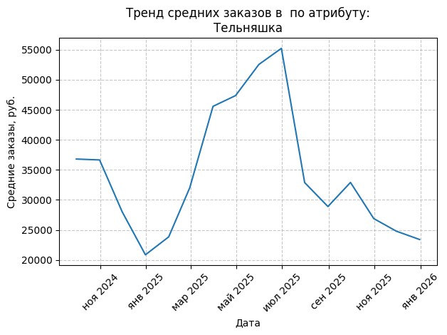 Средняя выручка (по заказам) по атрибуту - 33400 руб./месяц. Максимальная выручка 156500 руб./месяц, на 370% больше среднего по атрибуту, была при цене от 15000 до 20000 руб. руб.