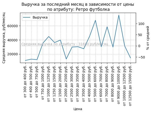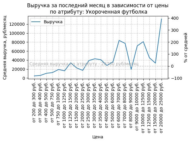 Средняя выручка (по заказам) по атрибуту - 27200 руб./месяц. Максимальная выручка 88700 руб./месяц, на 230% больше среднего по атрибуту, была при цене от 10000 до 12500 руб. руб.
