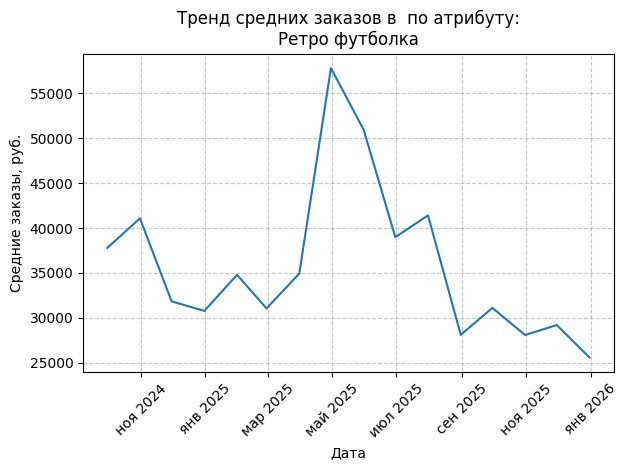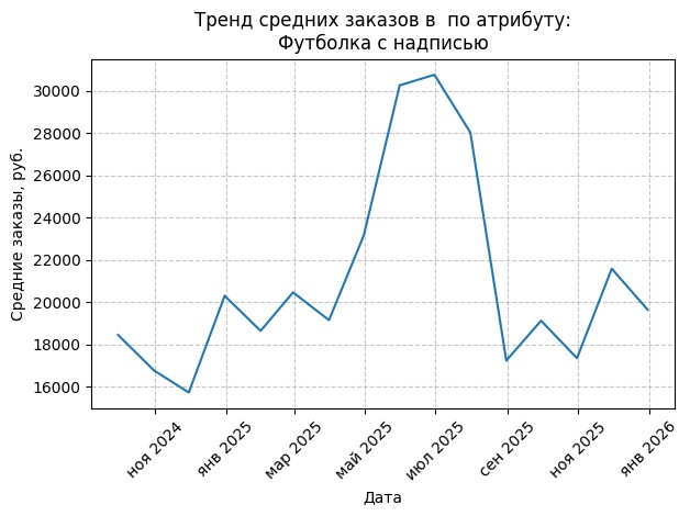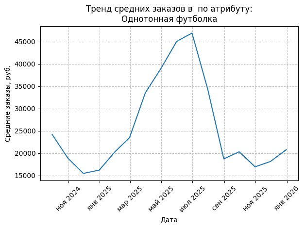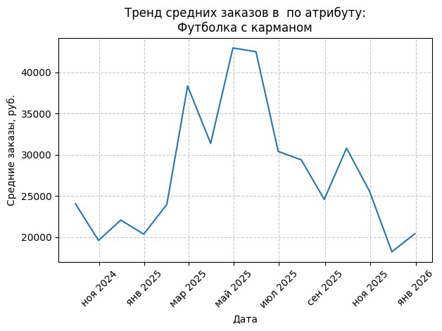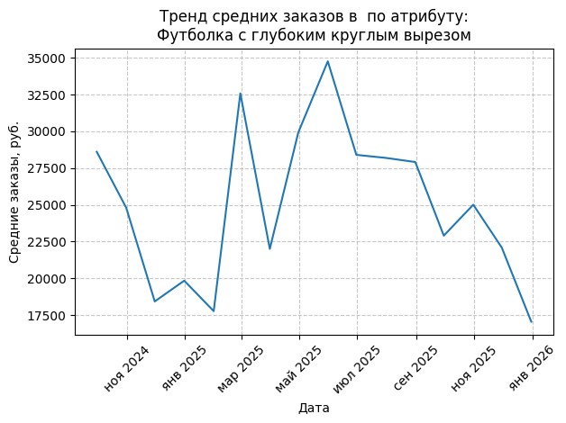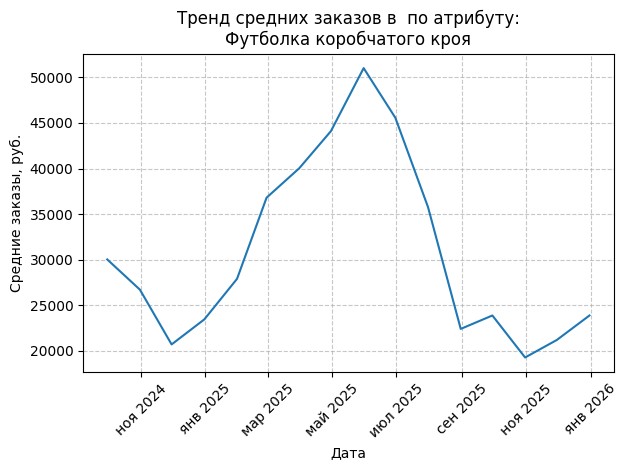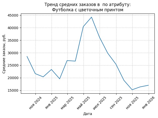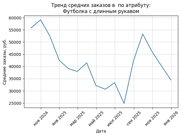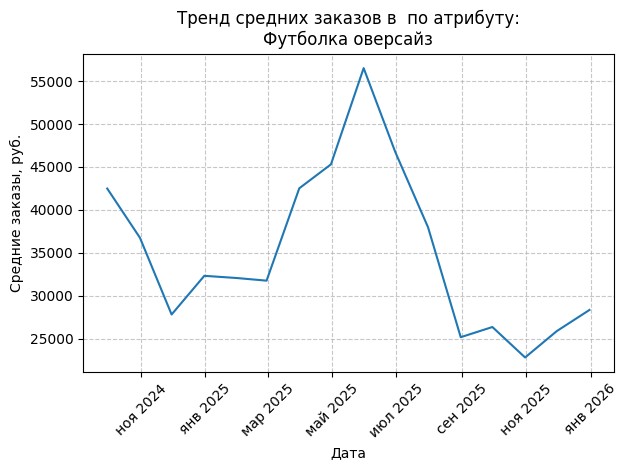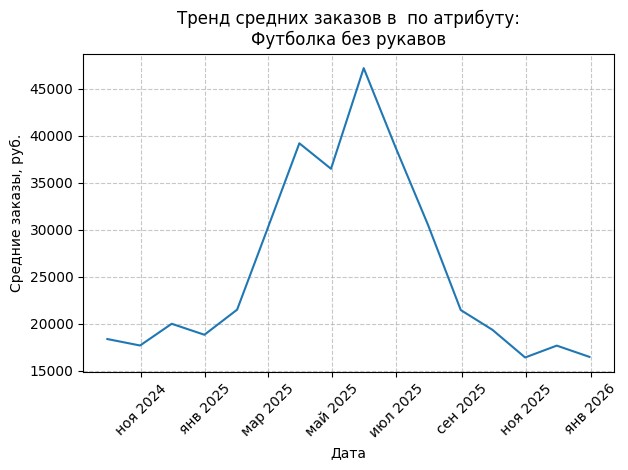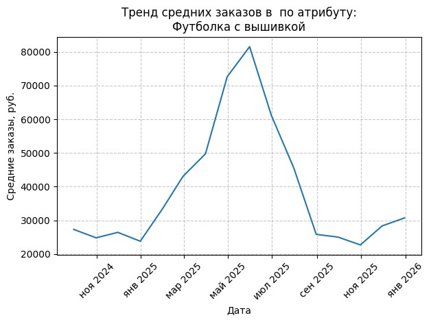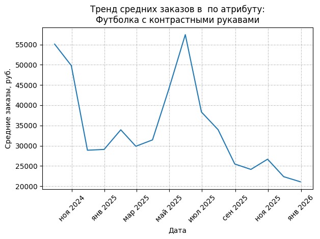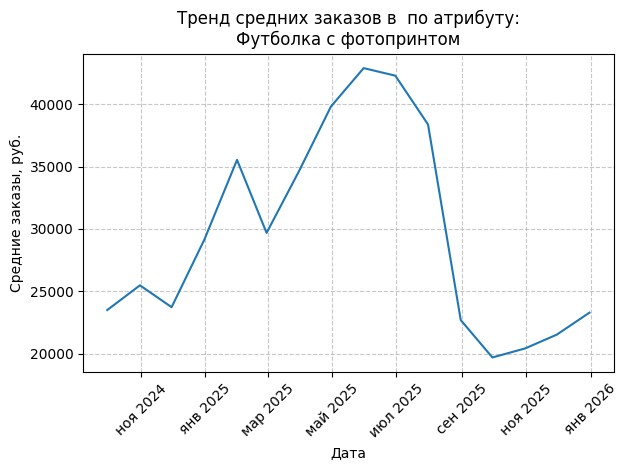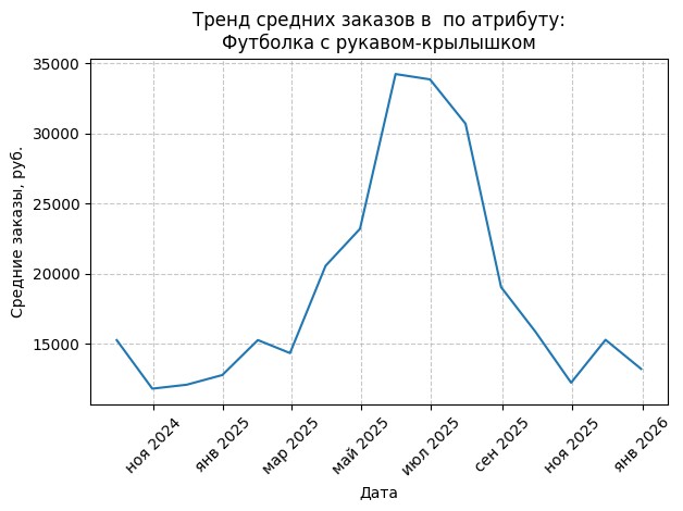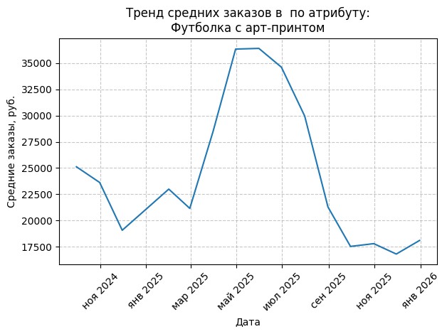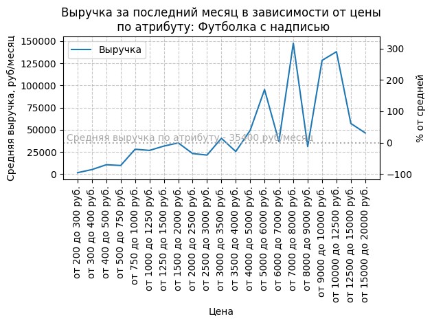 Средняя выручка (по заказам) по атрибуту - 27600 руб./месяц. Максимальная выручка 60200 руб./месяц, на 120% больше среднего по атрибуту, была при цене от 6000 до 7000 руб. руб.