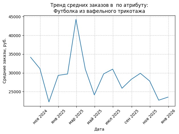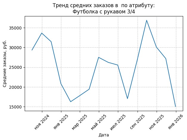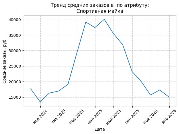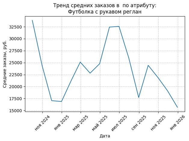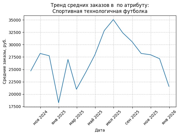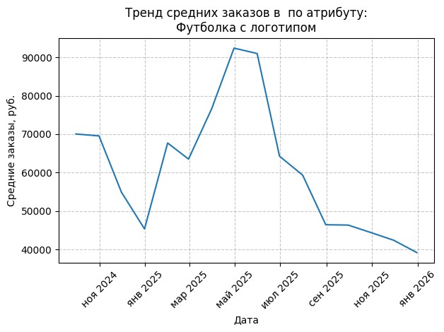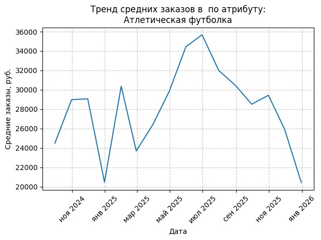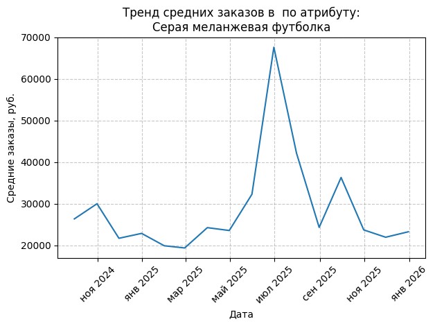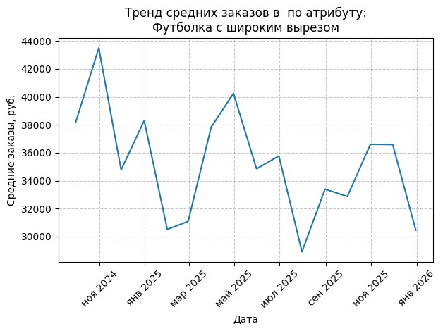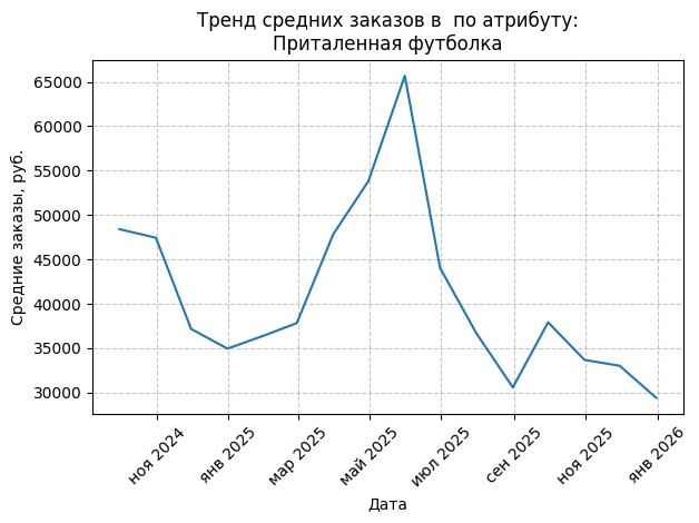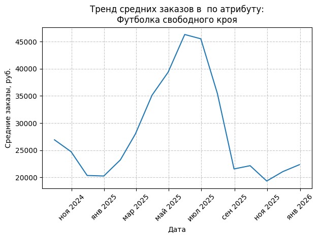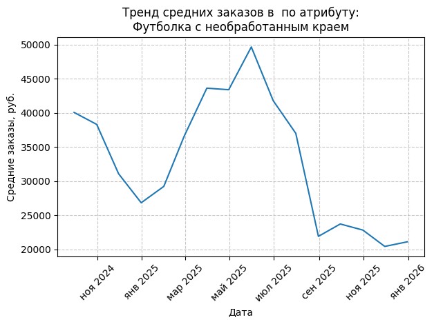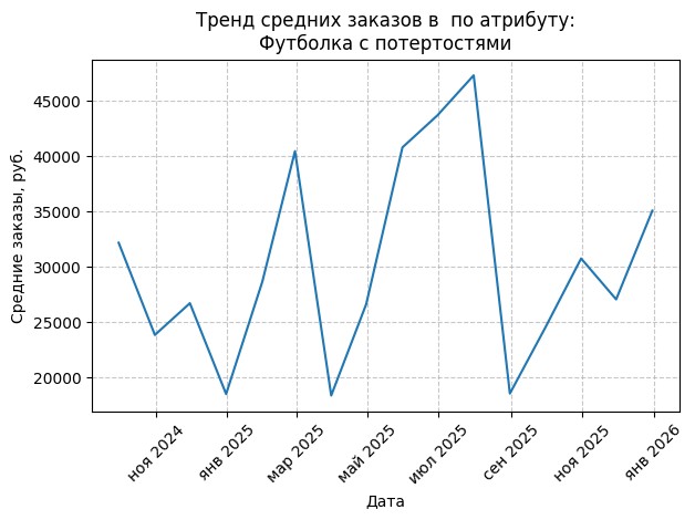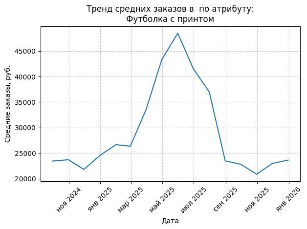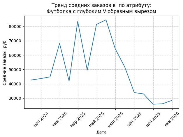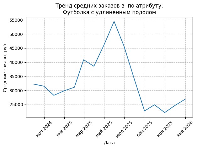 Средняя выручка (по заказам) по атрибуту - 27600 руб./месяц. Максимальная выручка 60200 руб./месяц, на 120% больше среднего по атрибуту, была при цене от 6000 до 7000 руб. руб.