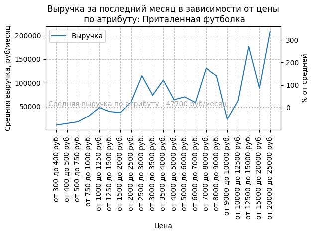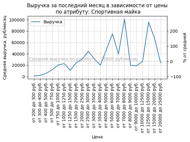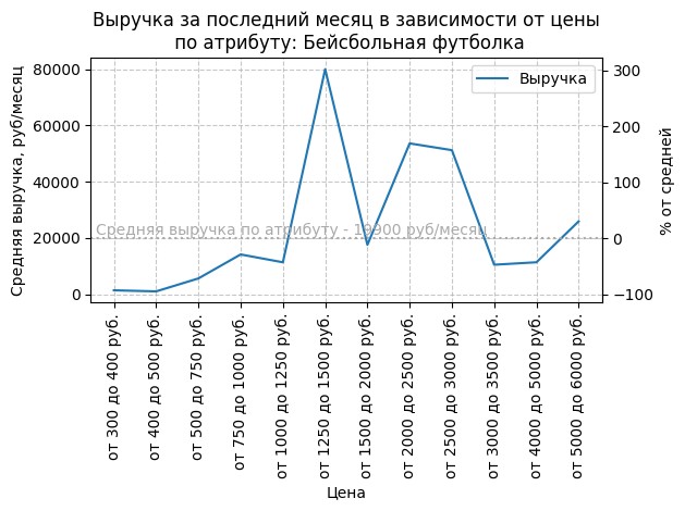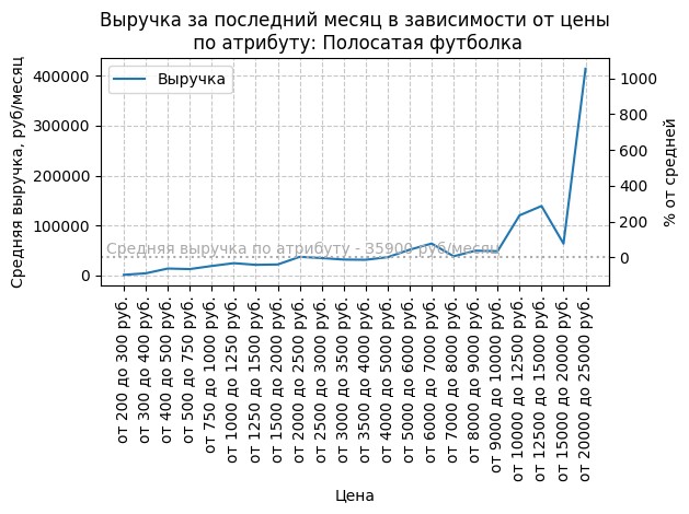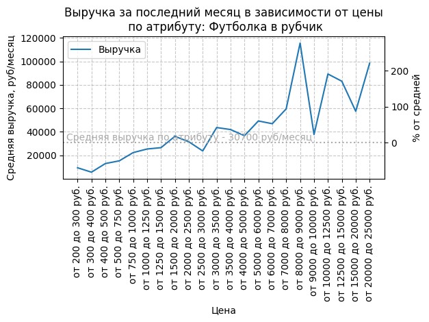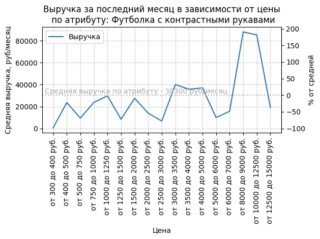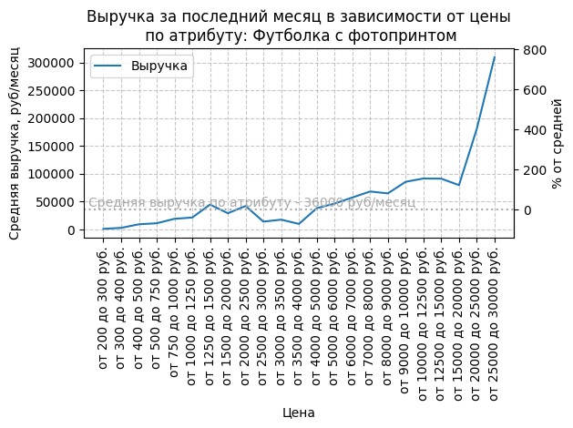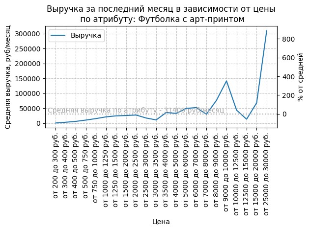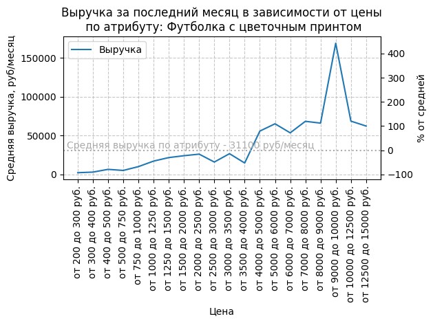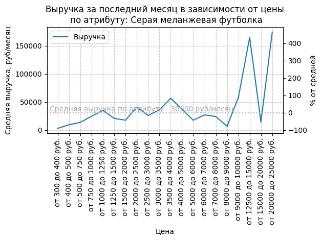 Средняя выручка (по заказам) по атрибуту - 30900 руб./месяц. Максимальная выручка 174300 руб./месяц, на 460% больше среднего по атрибуту, была при цене от 20000 до 25000 руб. руб.