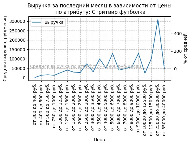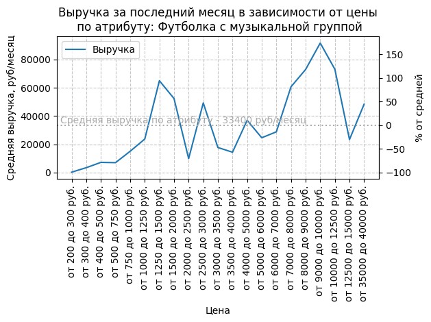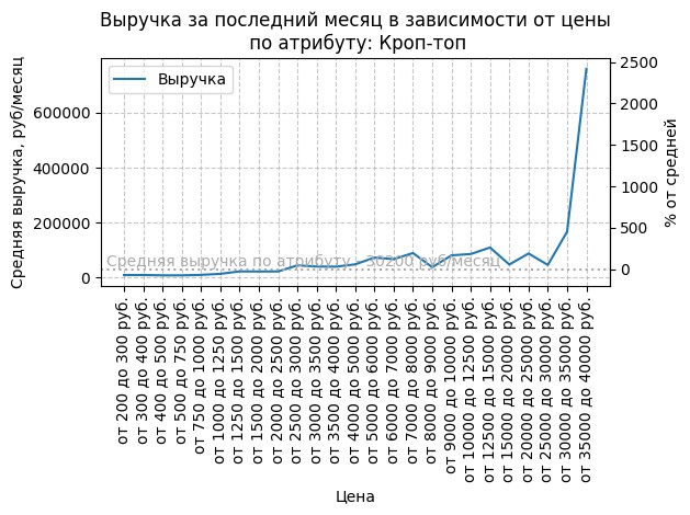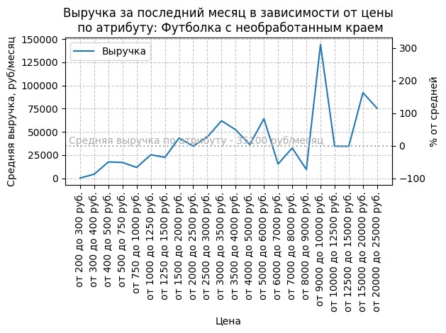 Средняя выручка (по заказам) по атрибуту - 43400 руб./месяц. Максимальная выручка 167000 руб./месяц, на 280% больше среднего по атрибуту, была при цене от 5000 до 6000 руб. руб.
