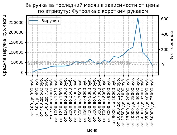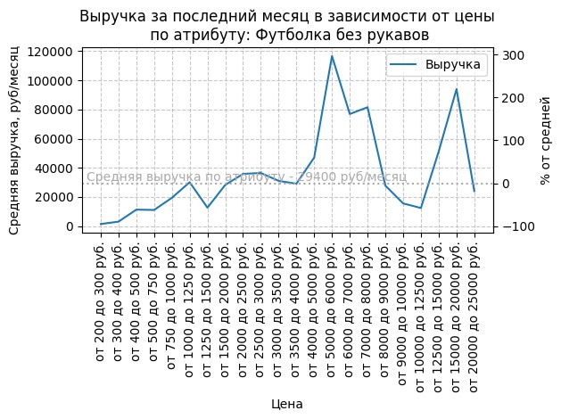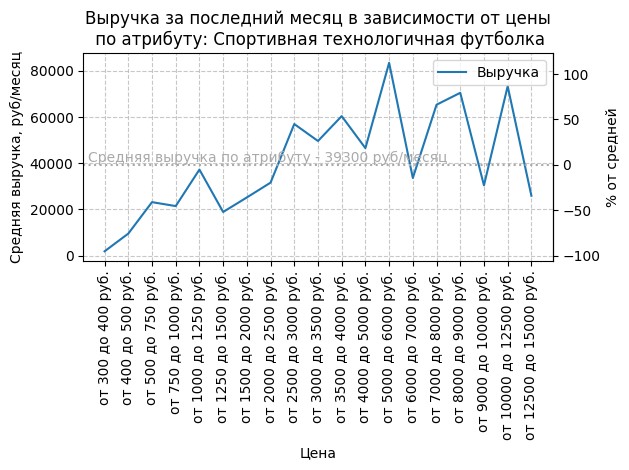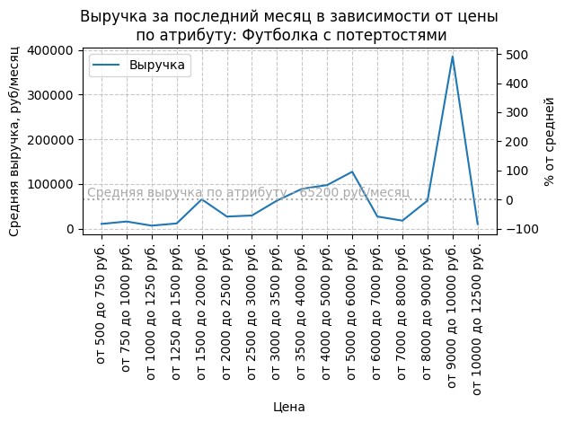 Средняя выручка (по заказам) по атрибуту - 65200 руб./месяц. Максимальная выручка 385800 руб./месяц, на 490% больше среднего по атрибуту, была при цене от 9000 до 10000 руб. руб.