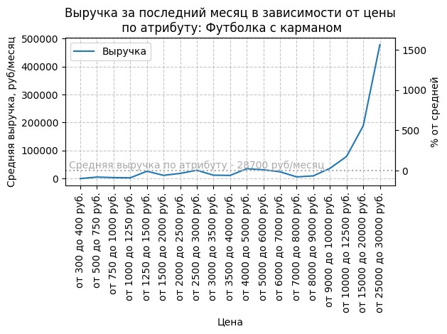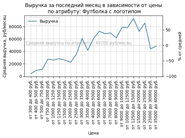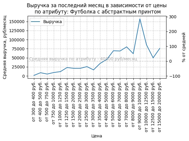 Средняя выручка (по заказам) по атрибуту - 42800 руб./месяц. Максимальная выручка 266900 руб./месяц, на 520% больше среднего по атрибуту, была при цене от 15000 до 20000 руб. руб.