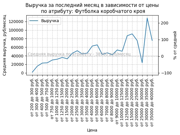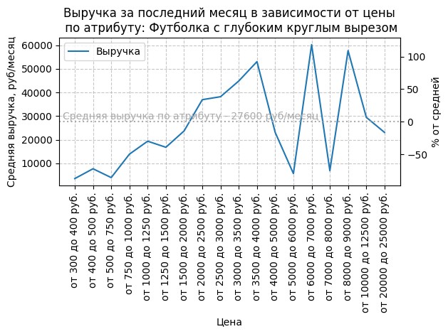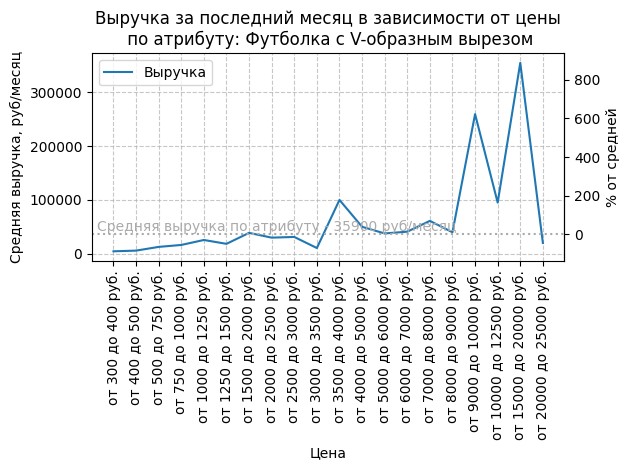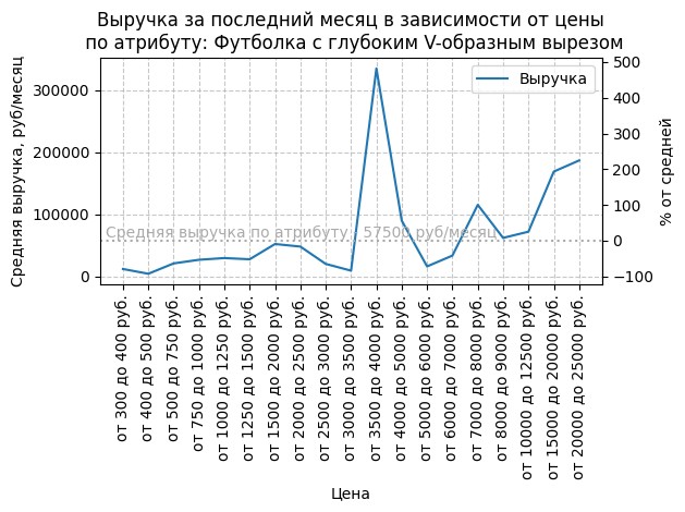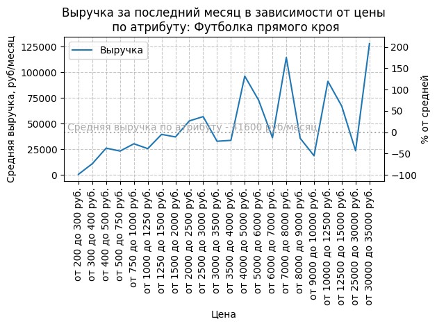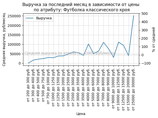 Средняя выручка (по заказам) по атрибуту - 35100 руб./месяц. Максимальная выручка 101300 руб./месяц, на 190% больше среднего по атрибуту, была при цене от 8000 до 9000 руб. руб.