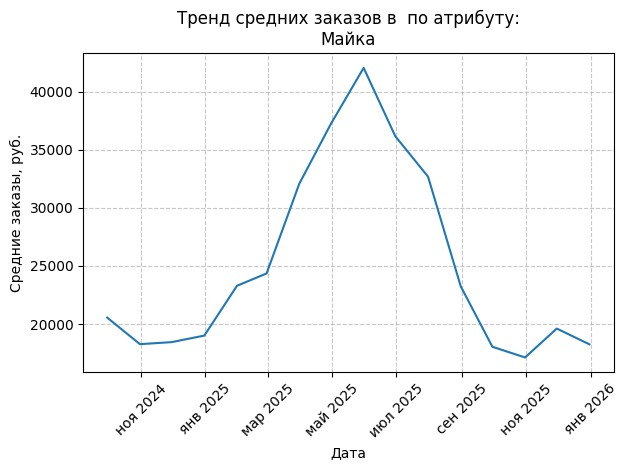 Средняя выручка (по заказам) по атрибуту - 23600 руб./месяц. Максимальная выручка 62000 руб./месяц, на 160% больше среднего по атрибуту, была при цене от 3500 до 4000 руб. руб.