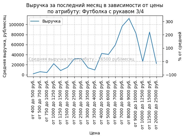 Средняя выручка (по заказам) по атрибуту - 57500 руб./месяц. Максимальная выручка 334700 руб./месяц, на 480% больше среднего по атрибуту, была при цене от 3500 до 4000 руб. руб.