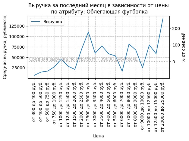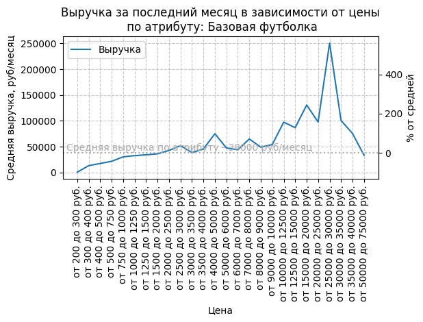 Средняя выручка (по заказам) по атрибуту - 46900 руб./месяц. Максимальная выручка 309700 руб./месяц, на 560% больше среднего по атрибуту, была при цене от 25000 до 30000 руб. руб.