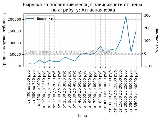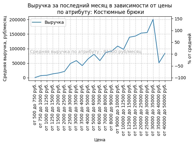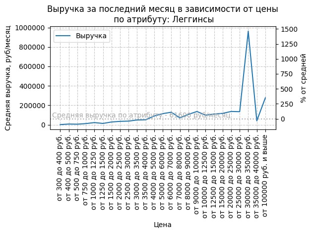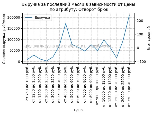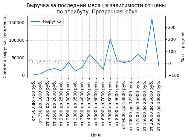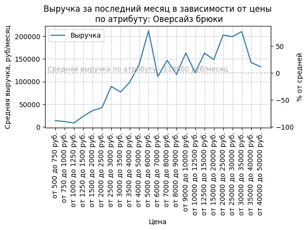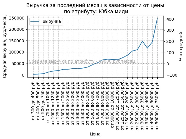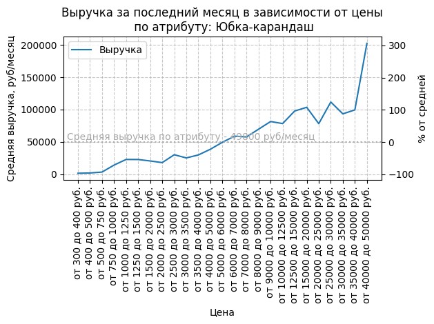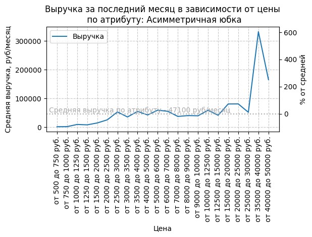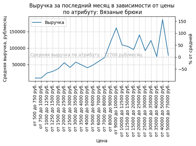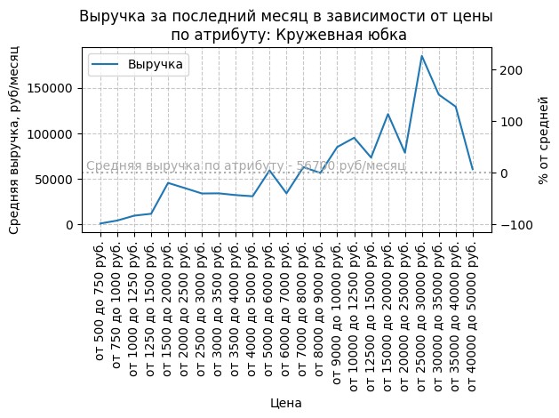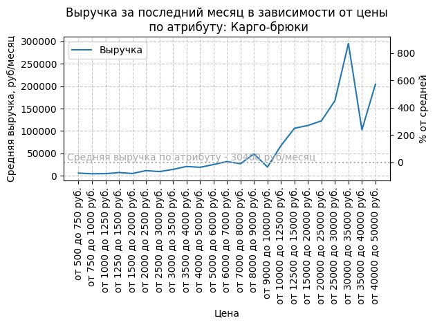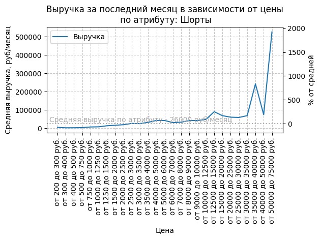 Средняя выручка (по заказам) по атрибуту - 34100 руб./месяц. Максимальная выручка 160900 руб./месяц, на 370% больше среднего по атрибуту, была при цене от 20000 до 25000 руб. руб.
