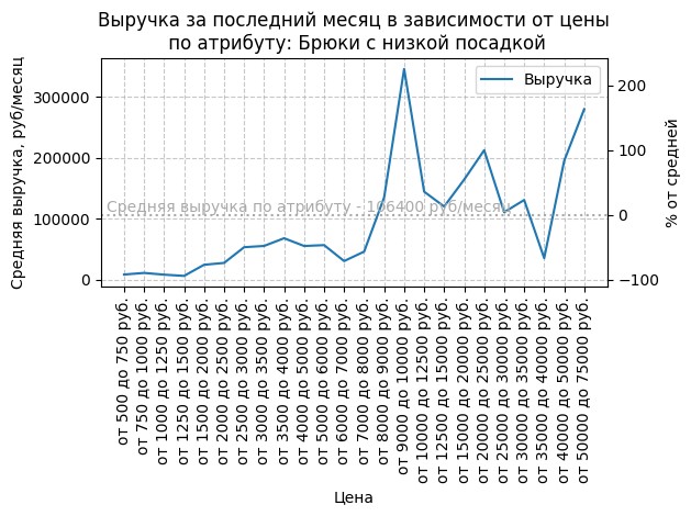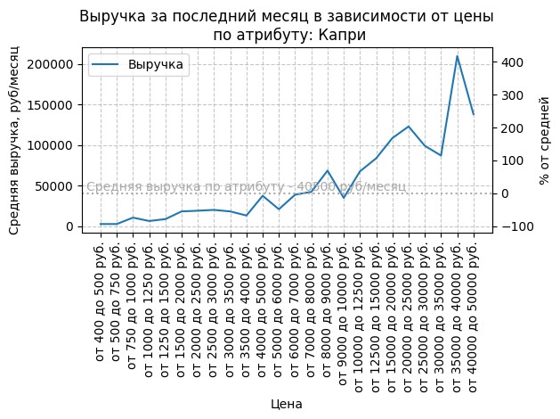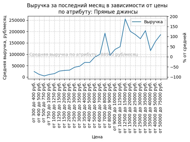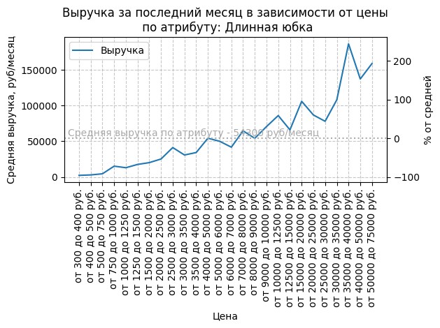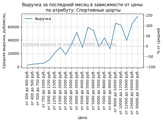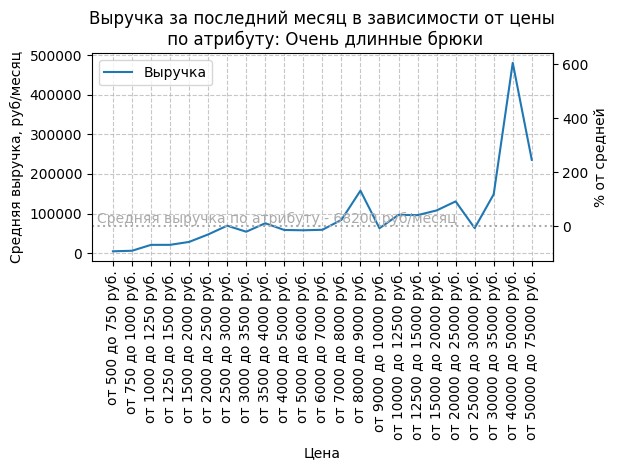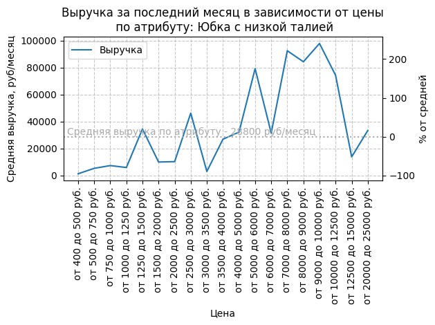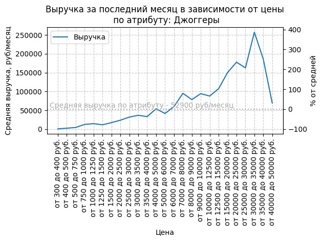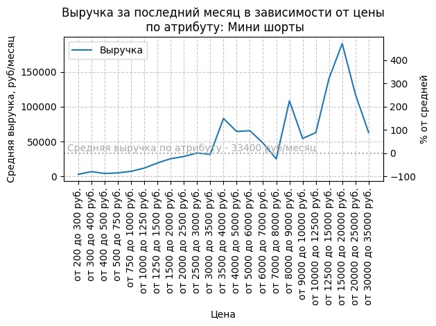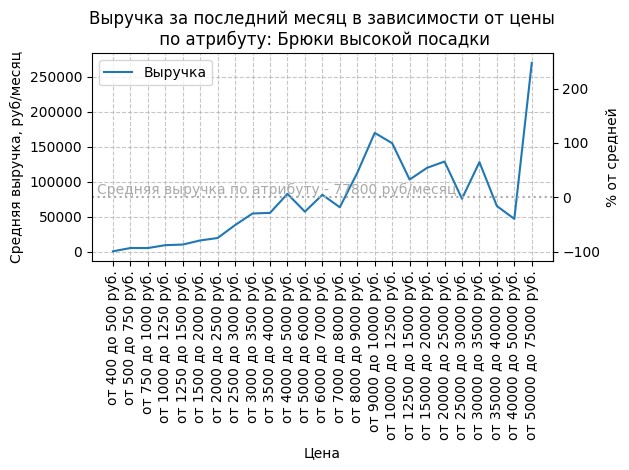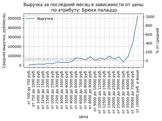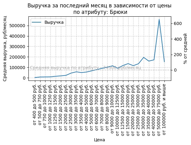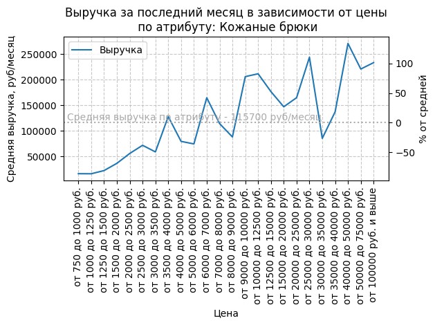 Средняя выручка (по заказам) по атрибуту - 34100 руб./месяц. Максимальная выручка 160900 руб./месяц, на 370% больше среднего по атрибуту, была при цене от 20000 до 25000 руб. руб.
