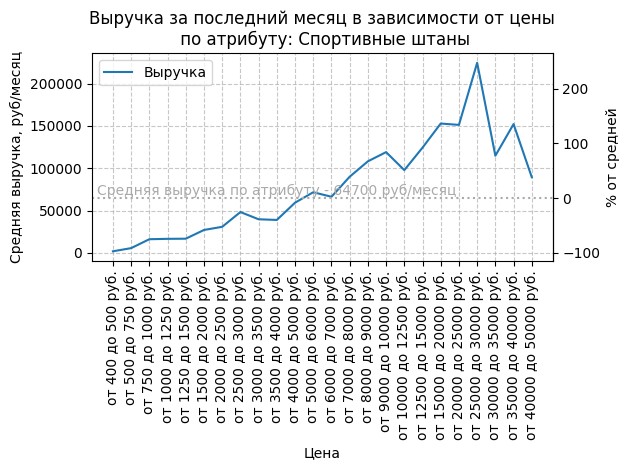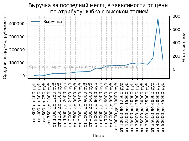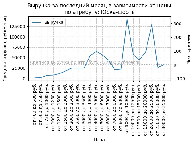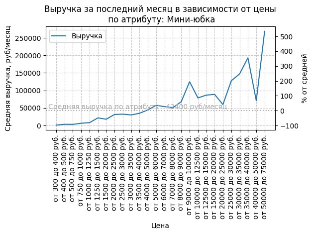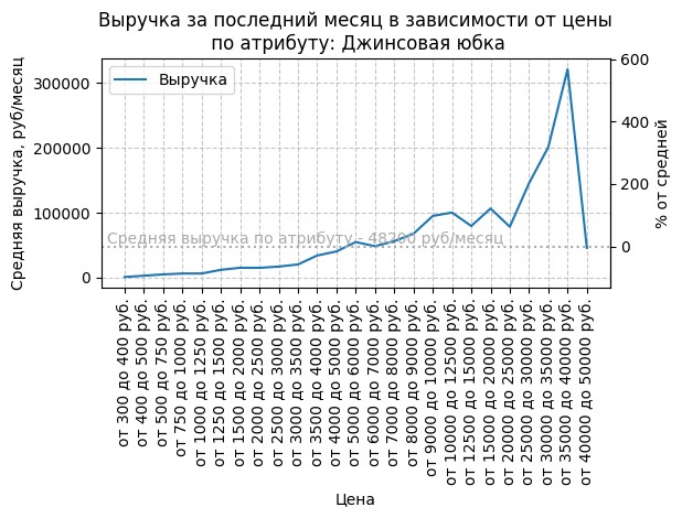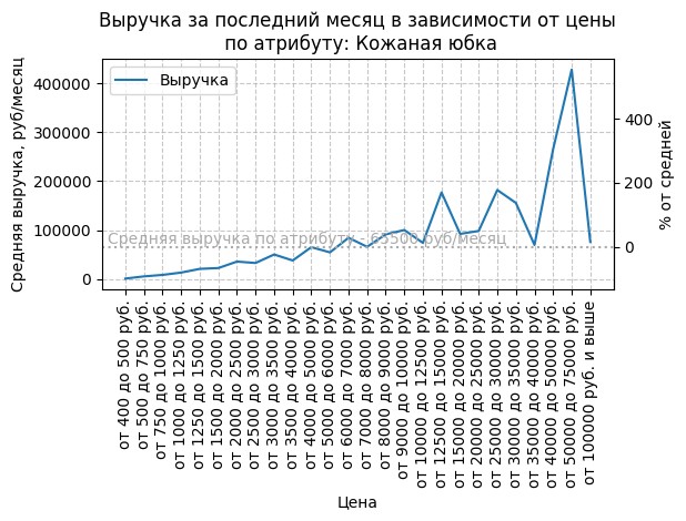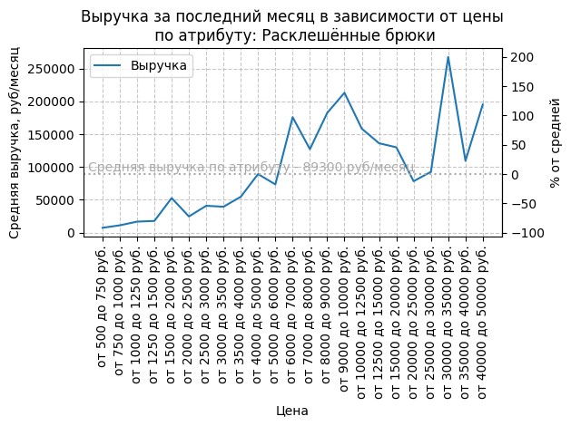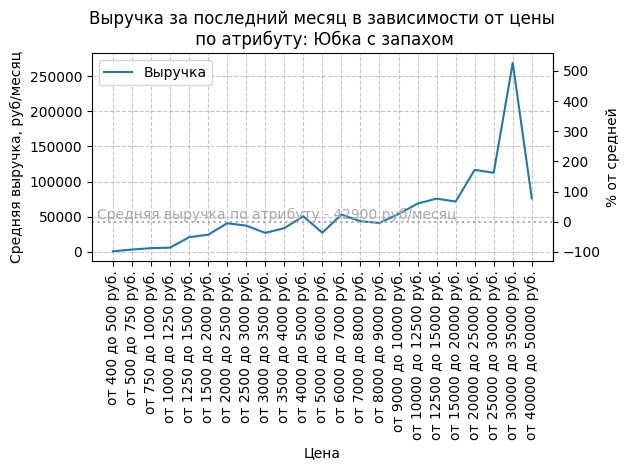 Средняя выручка (по заказам) по атрибуту - 54500 руб./месяц. Максимальная выручка 214100 руб./месяц, на 290% больше среднего по атрибуту, была при цене от 20000 до 25000 руб. руб.