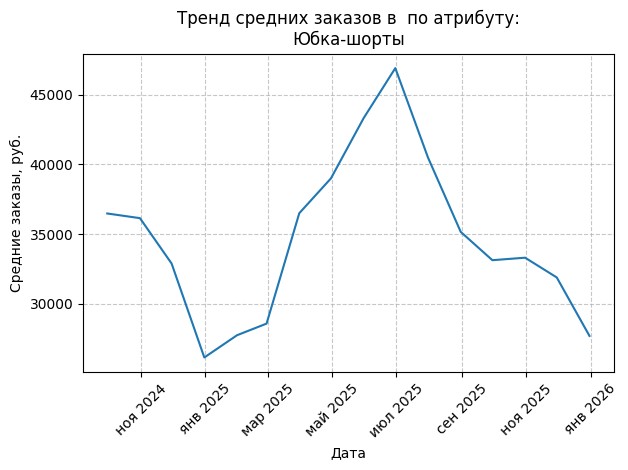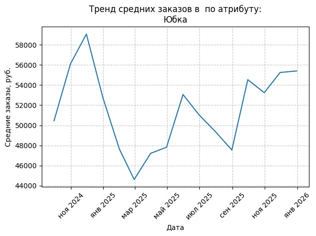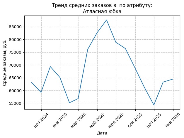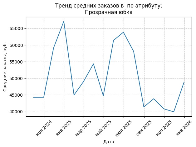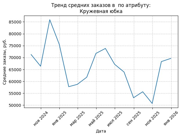 Средняя выручка (по заказам) по атрибуту - 42900 руб./месяц. Максимальная выручка 269000 руб./месяц, на 530% больше среднего по атрибуту, была при цене от 30000 до 35000 руб. руб.