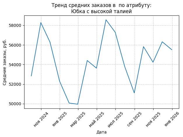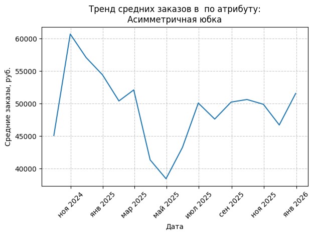 Средняя выручка (по заказам) по атрибуту - 72700 руб./месяц. Максимальная выручка 186800 руб./месяц, на 160% больше среднего по атрибуту, была при цене от 40000 до 50000 руб. руб.