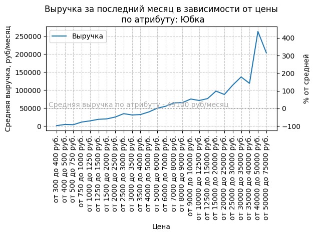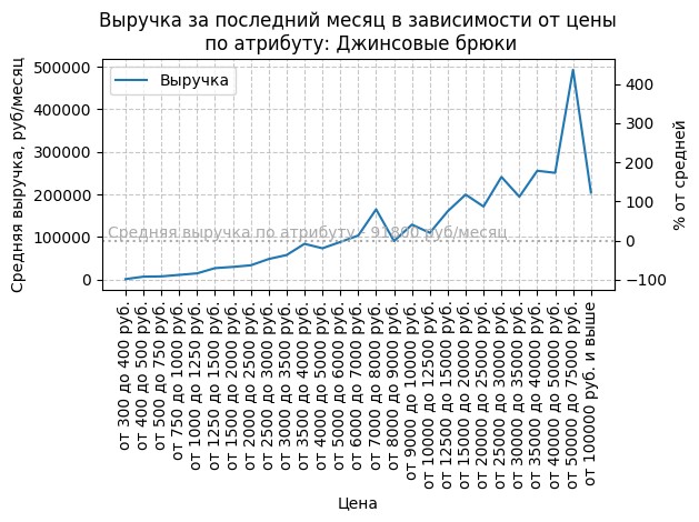 Средняя выручка (по заказам) по атрибуту - 30900 руб./месяц. Максимальная выручка 75700 руб./месяц, на 140% больше среднего по атрибуту, была при цене от 30000 до 35000 руб. руб.