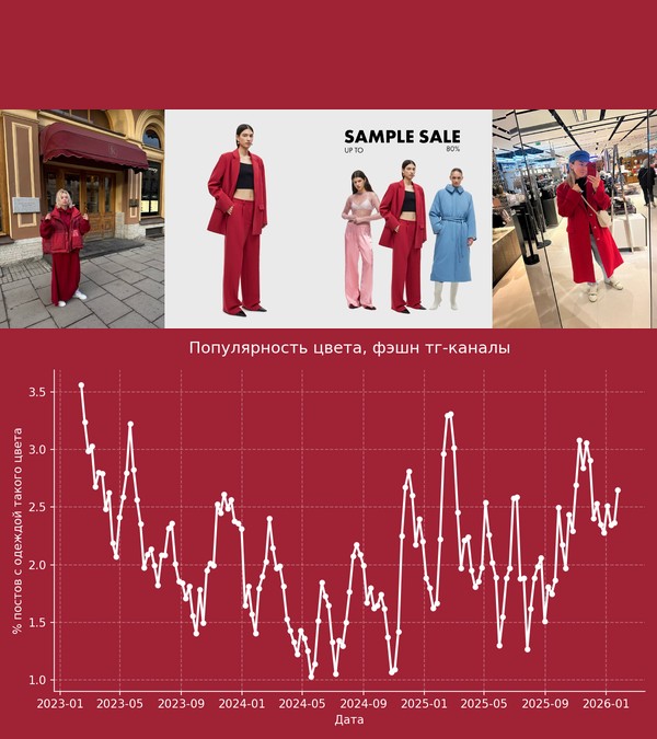 - Брюки (Pants) и Юбки (Skirt): Их показатели редко превышают 0.5–0.7%. Люди редко покупают «низ» в таком активном цвете, предпочитая оставлять его для акцентов у лица.