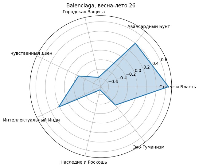 Чего здесь нет: Реакция на классику и комфорт Самые интересные цифры — в глубоком «минусе». Рекордное отрицание «Наследия и Роскоши» (-0.70) подтверждает, что Balenciaga окончательно порывает с эстетикой «тихой роскоши» и традиционным буржуазным шиком. Коллекция лишена «Городской Защиты» (-0.56) — это не уютная униформа для того, чтобы спрятаться, это одежда для нападения. Здесь нет места «Чувственному Дзену» (-0.24) или «Эко-Гуманизму» (-0.27): коллекция подчеркнуто индустриальна, лишена природной мягкости и тактильного тепла.