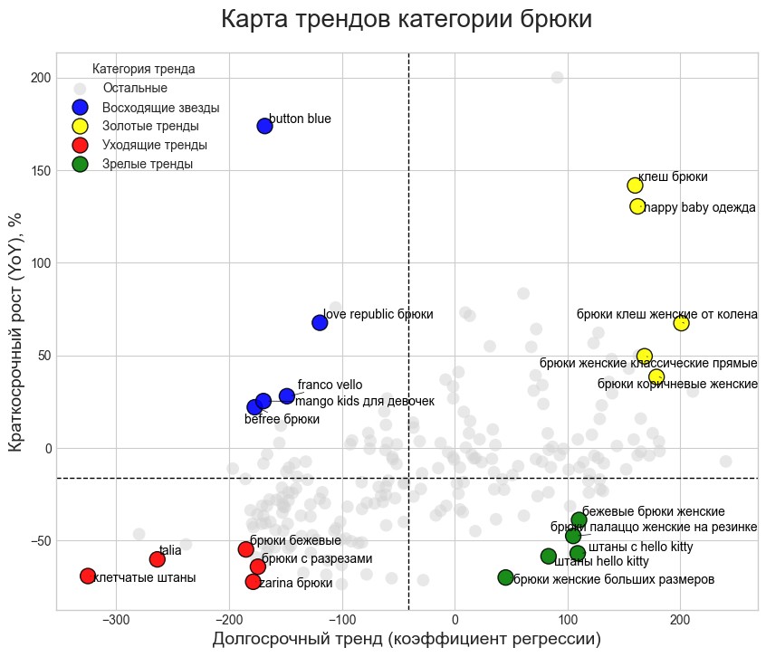 Карта трендов - это визуальный анализ популярности поисковых запросов в категории “Брюки” за последние два года.