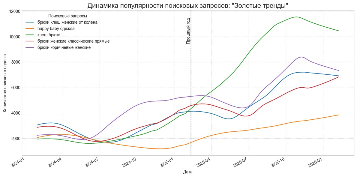| Клёш | «клеш брюки» (+141%), «брюки клеш от колена» (+67%), «штаны клеш» (+62%) | Множественные запросы в золоте |