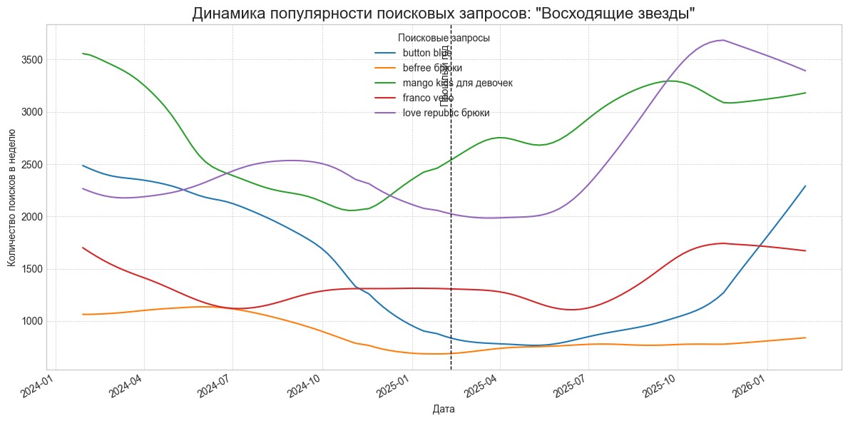 Инсайт: Ушедшие западные бренды наконец теряют «хвост» брендового поиска. Российские и турецкие бренды (Zarina, Befree, Koton, Love Republic) подхватывают этот спрос. Для селлеров — возможность занять позиции по брендовым запросам через SEO.