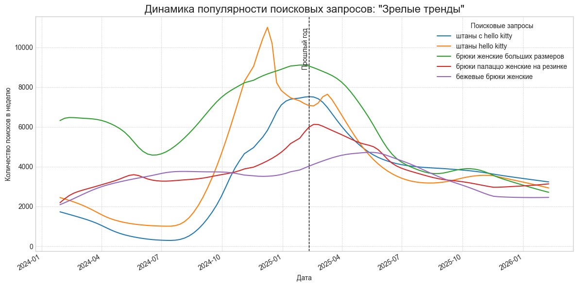 | Бананы (мужские) | «брюки мужские бананы» — долгосрочный тренд 172 | Зрелый, но ещё жив |