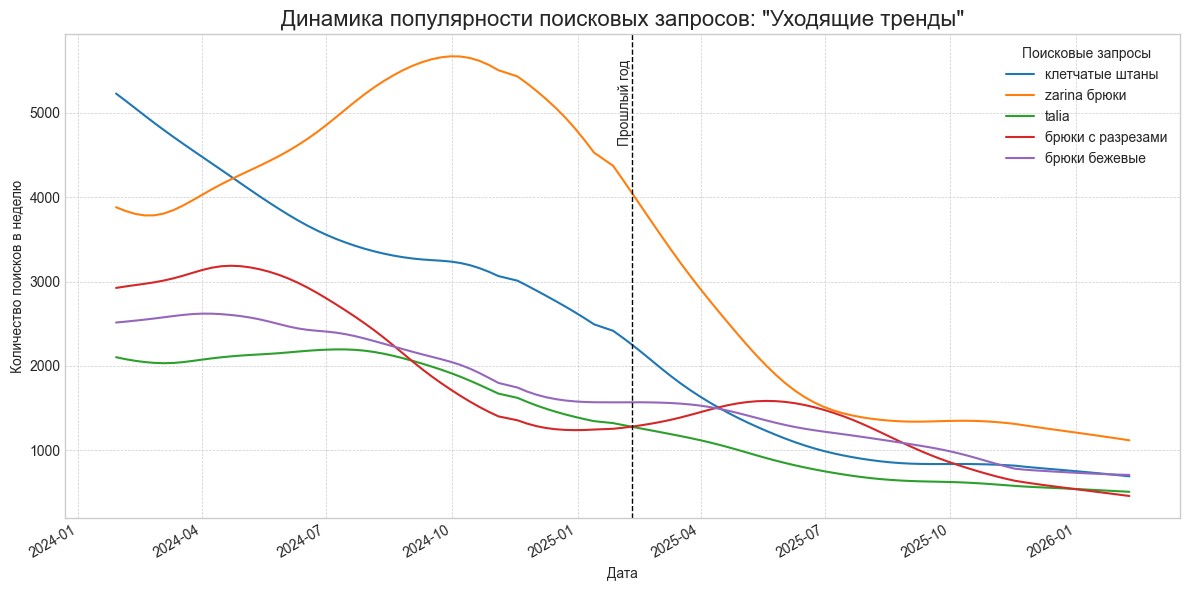 | Оверсайз | «штаны оверсайз» (−42%), «оверсайз штаны» (−51%) | Уходящий |