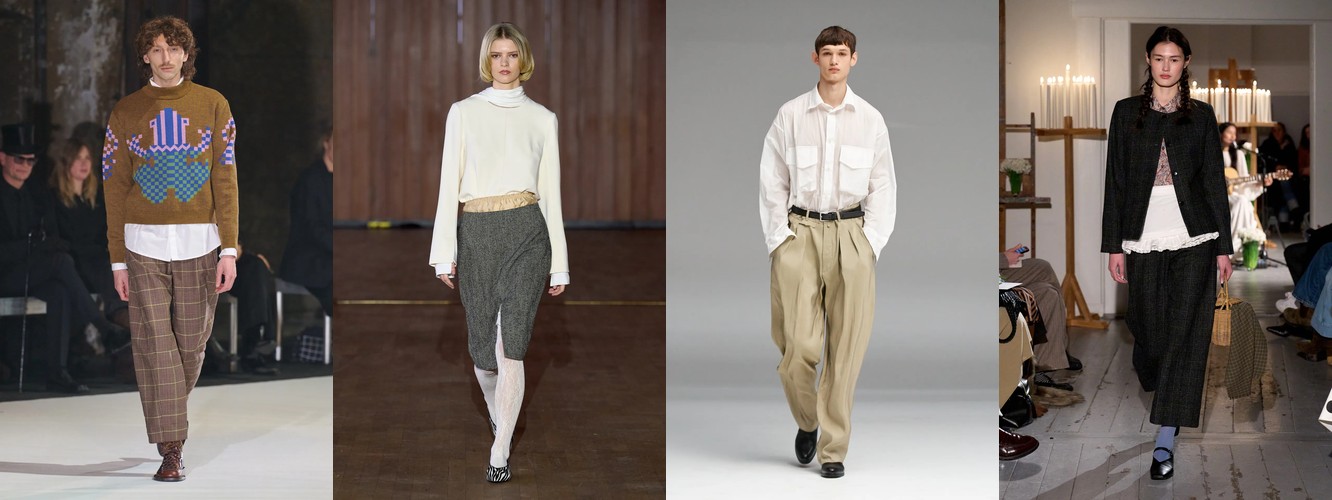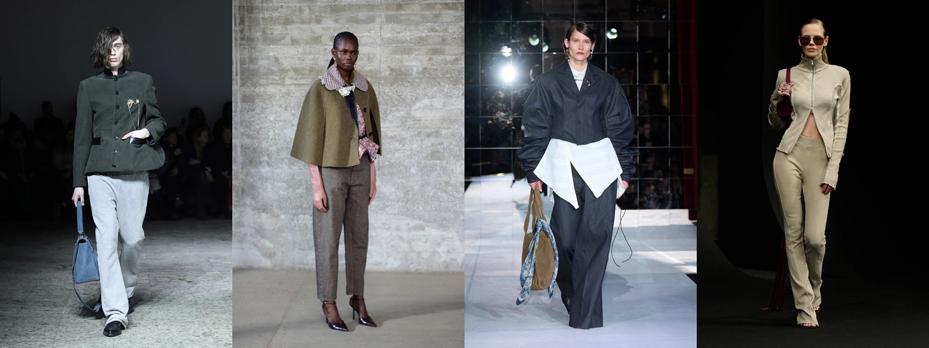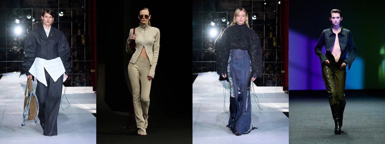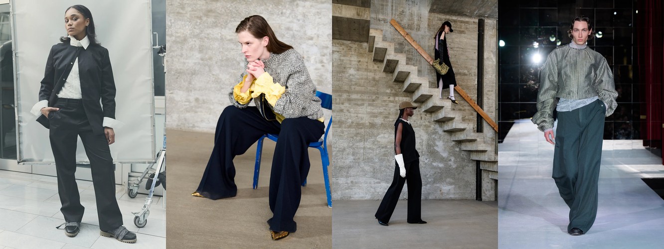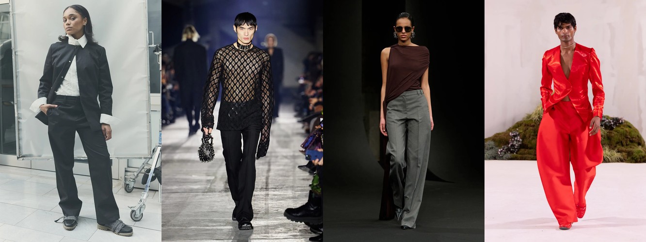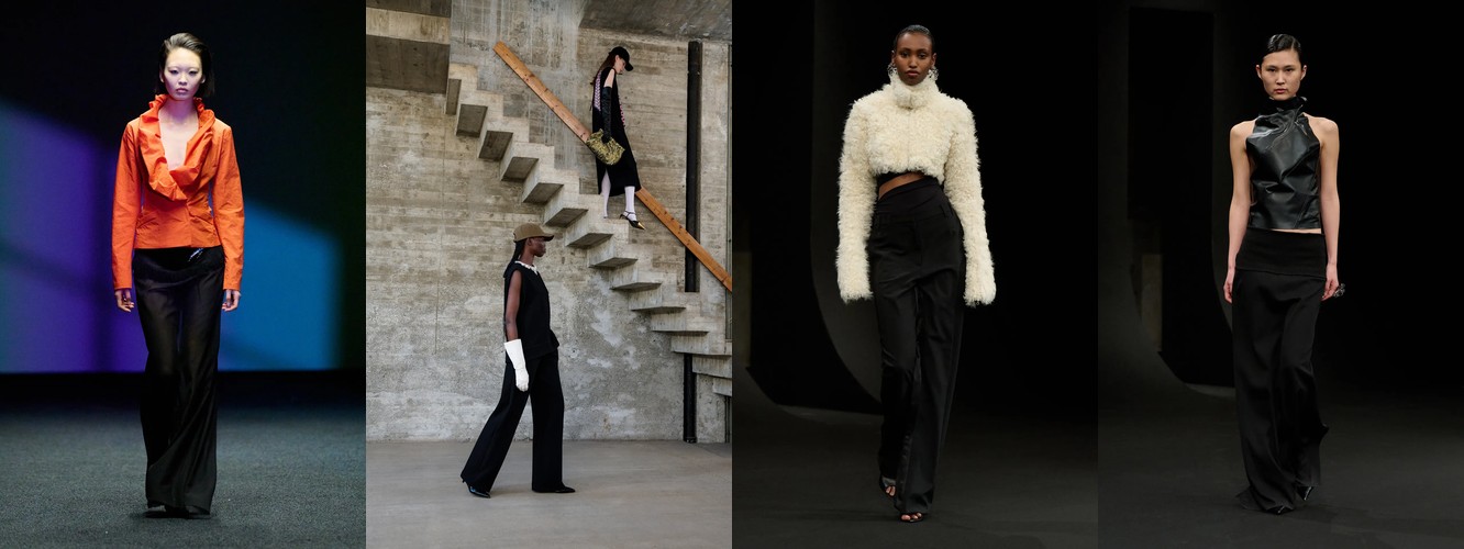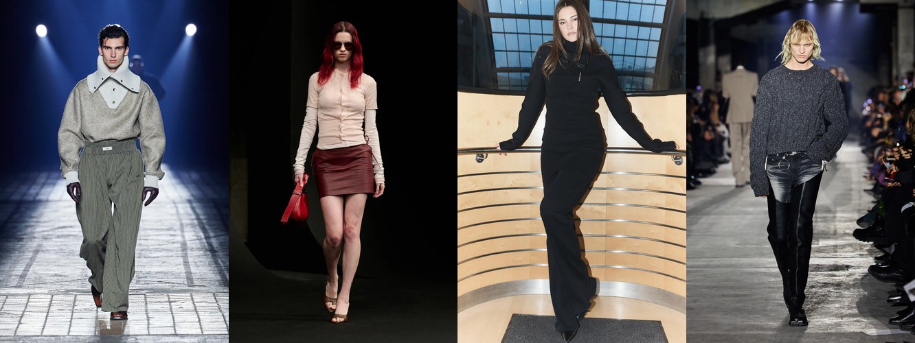 Нижняя часть тела стремительно «сушится»: брюки широкого кроя (−2,34 п.п.), широкие джинсы (−1,91 п.п.), экстремально длинные брюки (−1,85 п.п.), палаццо (−0,97 п.п.). Эра «жидкого низа», когда ноги утопали в метрах свободной ткани, подходит к финалу. Прямой крой стабилен (+0,09 п.п.), высокая посадка растёт (+1,31 п.п.) — брюки становятся более определёнными, более «читаемыми» в своей конструкции.