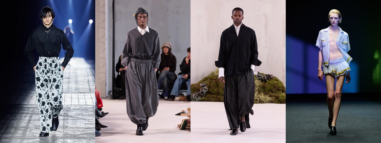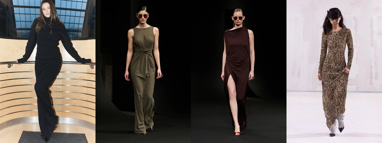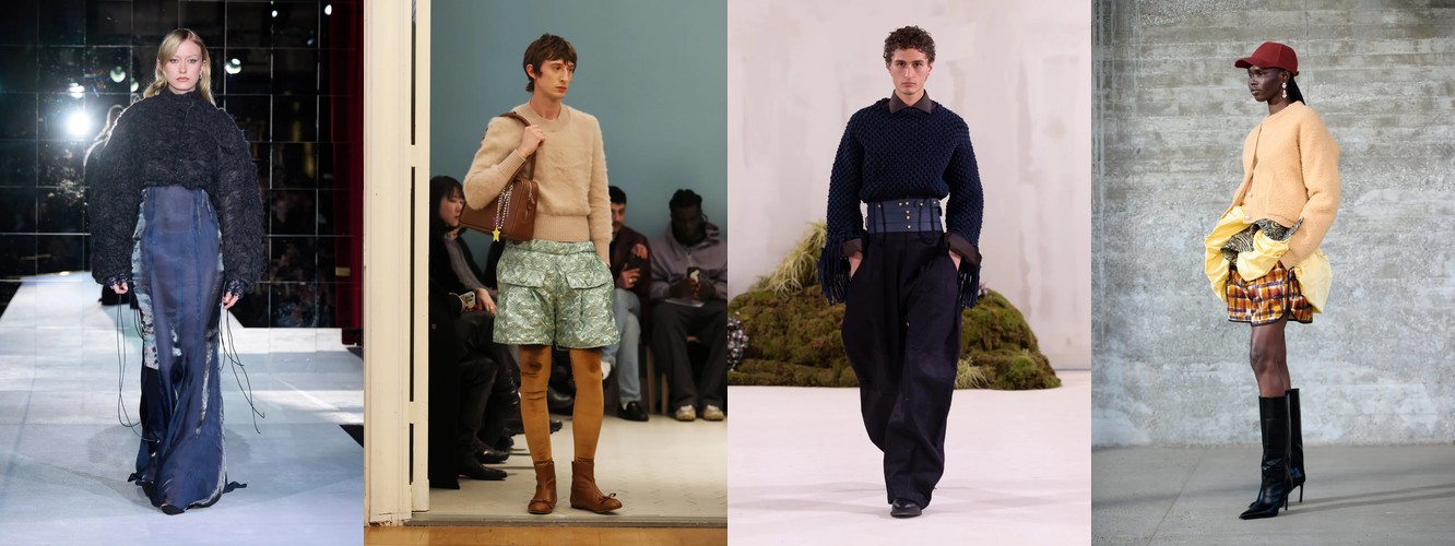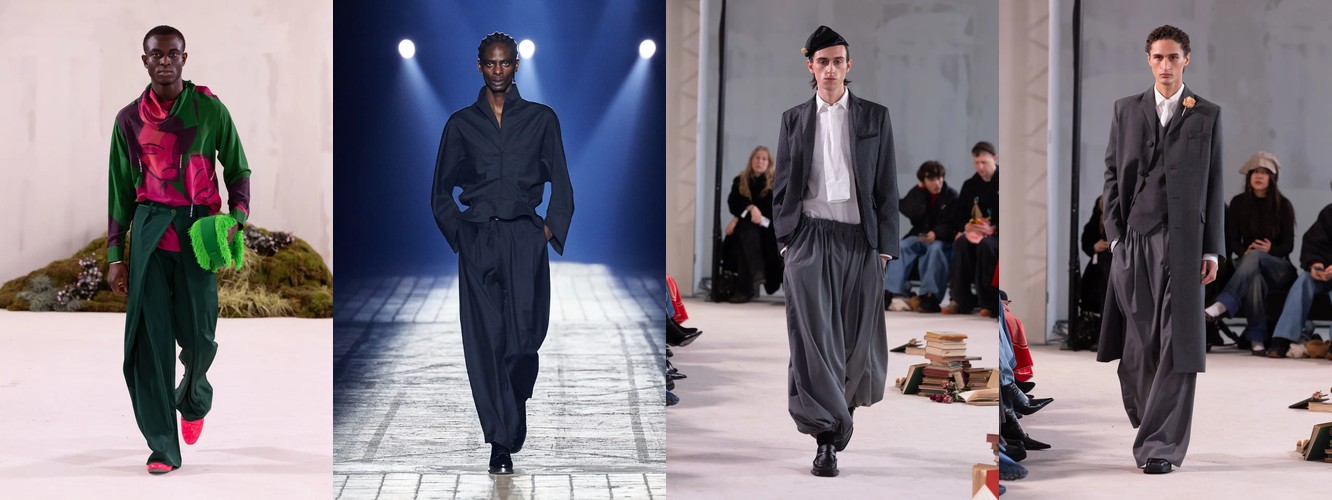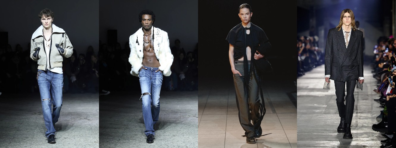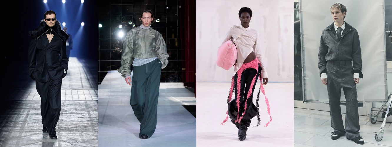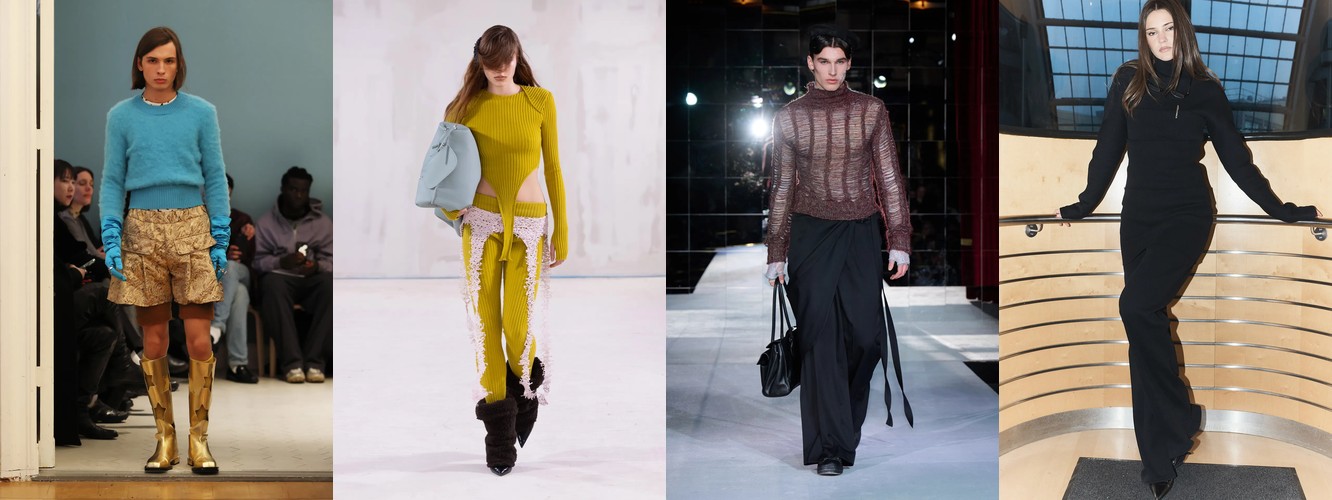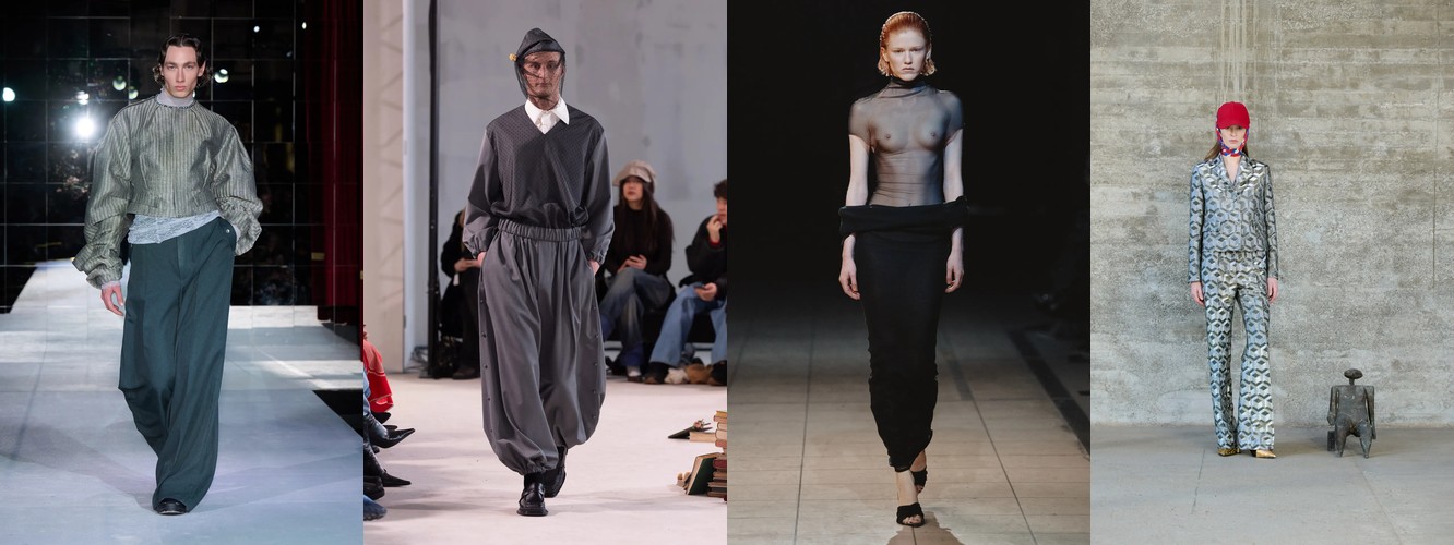 Нижняя часть тела стремительно «сушится»: брюки широкого кроя (−2,34 п.п.), широкие джинсы (−1,91 п.п.), экстремально длинные брюки (−1,85 п.п.), палаццо (−0,97 п.п.). Эра «жидкого низа», когда ноги утопали в метрах свободной ткани, подходит к финалу. Прямой крой стабилен (+0,09 п.п.), высокая посадка растёт (+1,31 п.п.) — брюки становятся более определёнными, более «читаемыми» в своей конструкции.