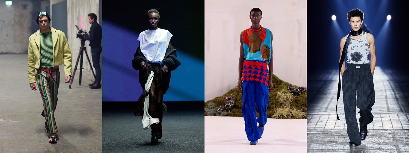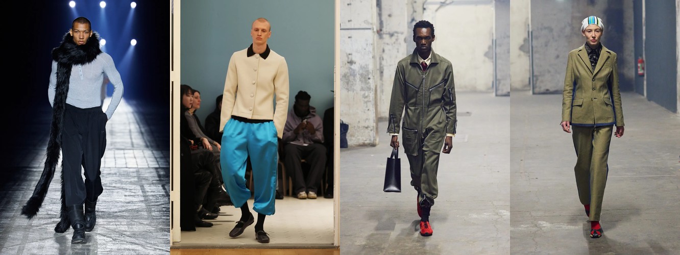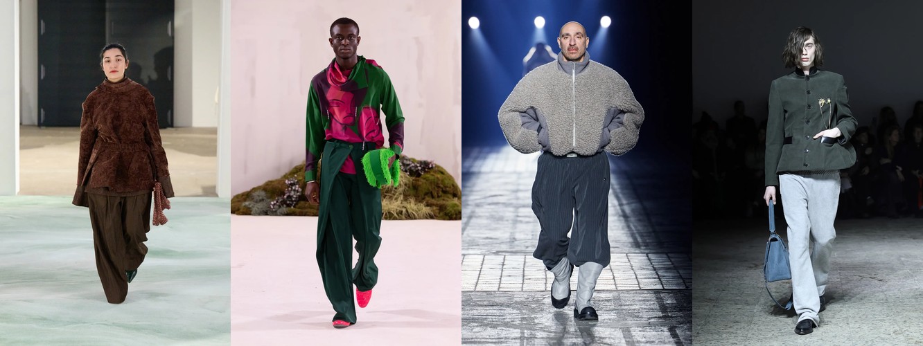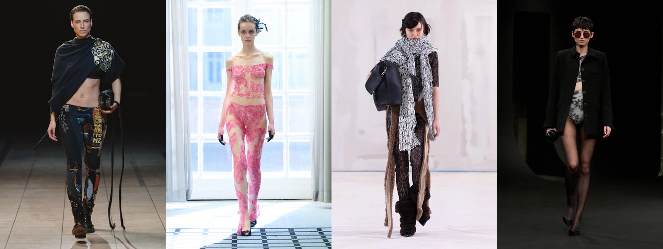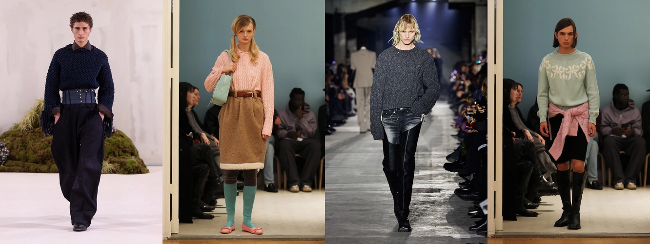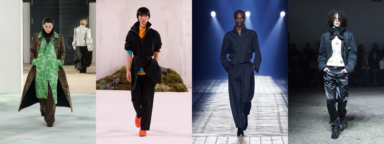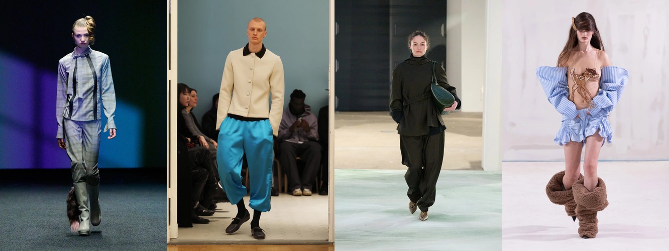 Нижняя часть тела стремительно «сушится»: брюки широкого кроя (−2,34 п.п.), широкие джинсы (−1,91 п.п.), экстремально длинные брюки (−1,85 п.п.), палаццо (−0,97 п.п.). Эра «жидкого низа», когда ноги утопали в метрах свободной ткани, подходит к финалу. Прямой крой стабилен (+0,09 п.п.), высокая посадка растёт (+1,31 п.п.) — брюки становятся более определёнными, более «читаемыми» в своей конструкции.