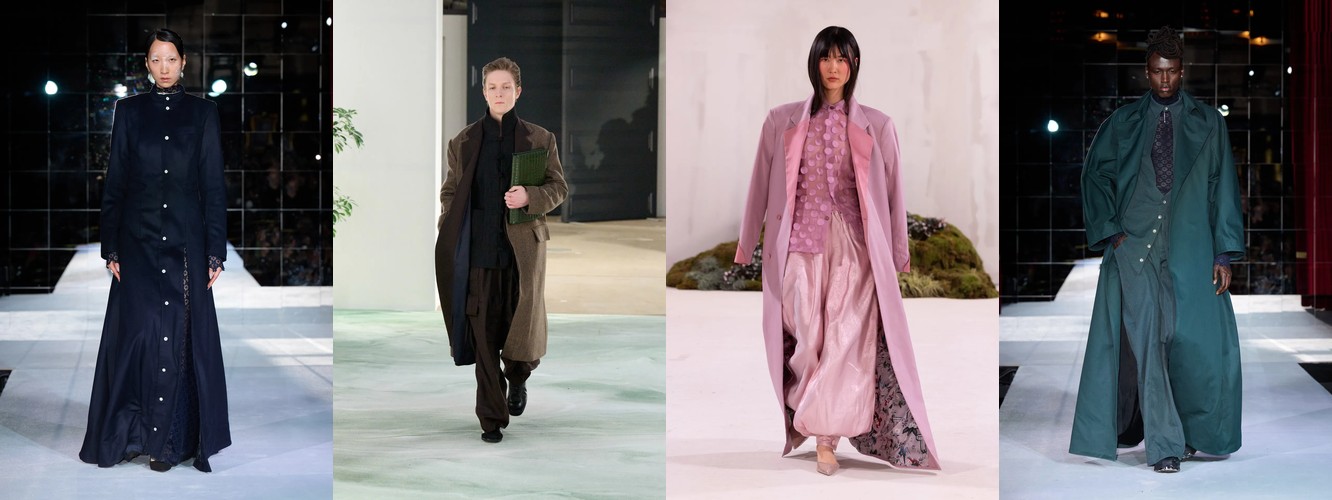 Воротник мао (мандарин) добавляет к этому восточноазиатскую культурную референцию, которая рифмуется с показом UNVAIN среди скульптур Feuerle Collection. Берлин не просто заимствует восточные элементы — он интегрирует их в свою версию «дисциплинированной сдержанности», где закрытое горло становится маркером контролируемой чувственности.