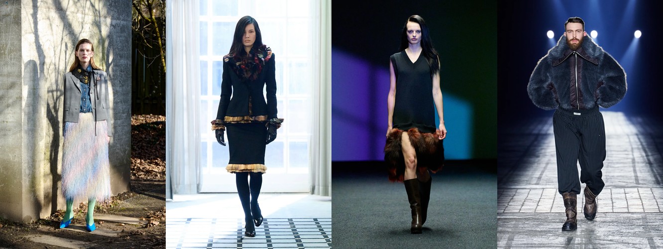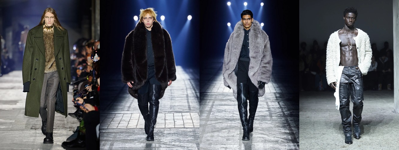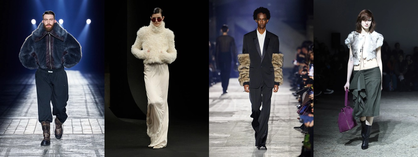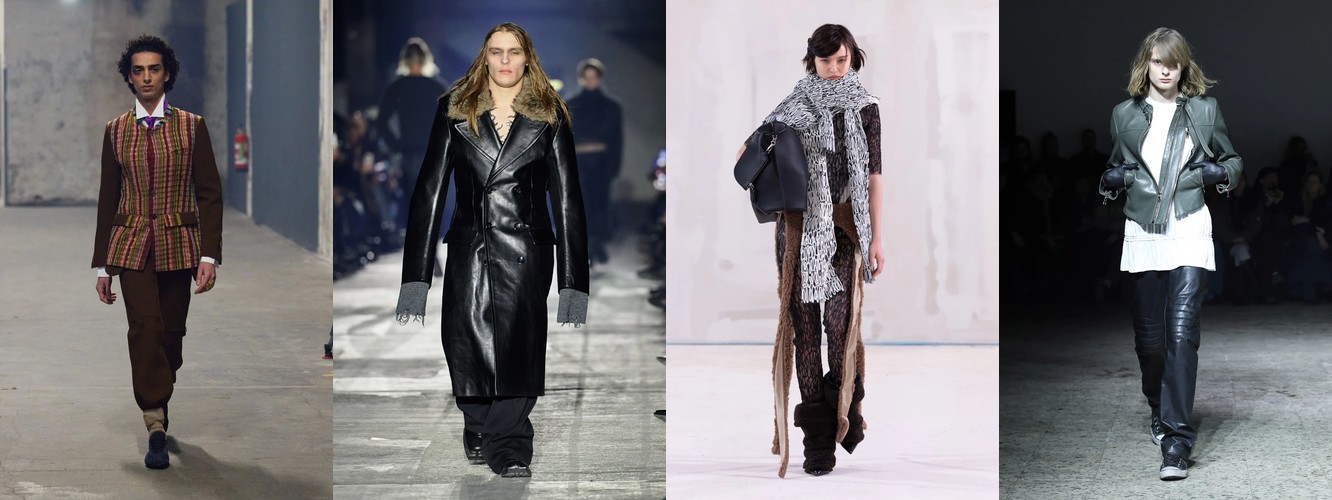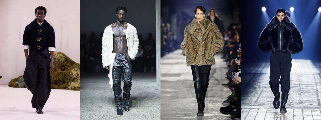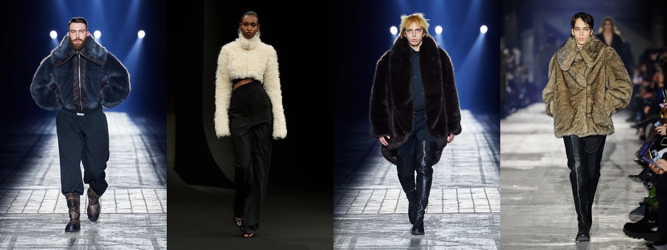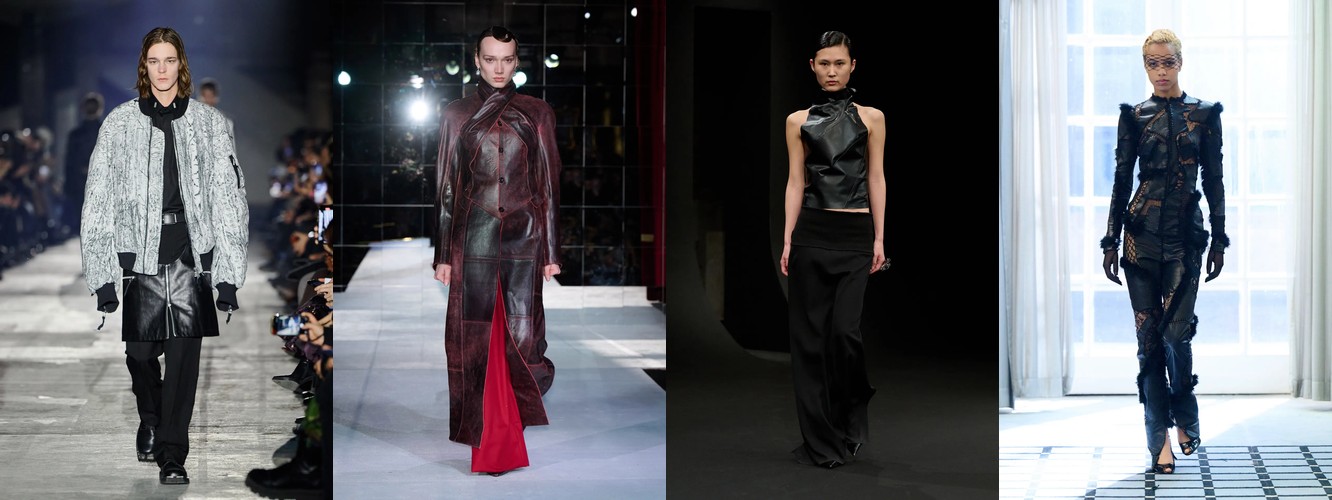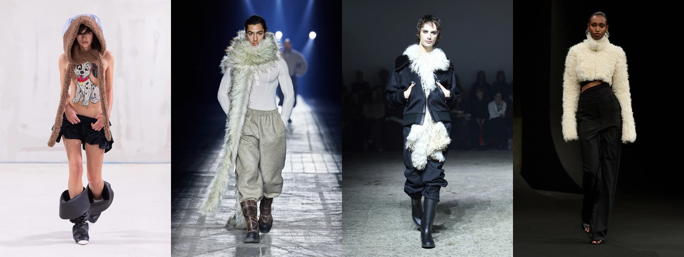 Параллельно отступает эстетика гладких поверхностей: кожаный total look (−1,25 п.п., охват −7), шнуровка (−1,78 п.п.), шнурок (−1,50 п.п.). Кожа как доминанта, которая диктовала «тёмную» сторону берлинской моды в предыдущих сезонах, передаёт эстафету меху и твиду. Общий вектор: от «жёсткого» к «сложному», от панка к мастерству.