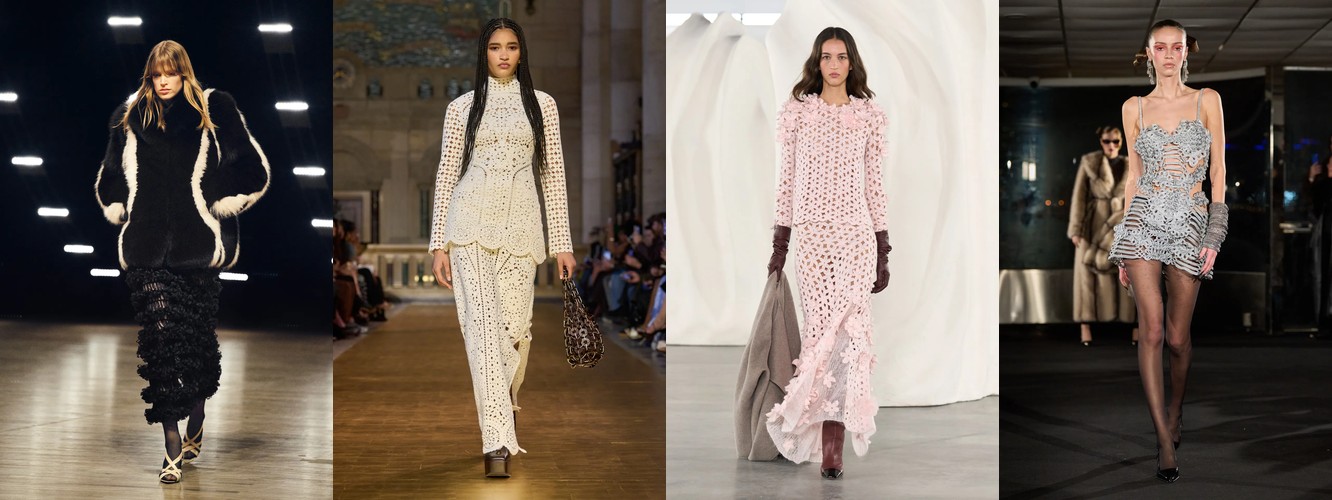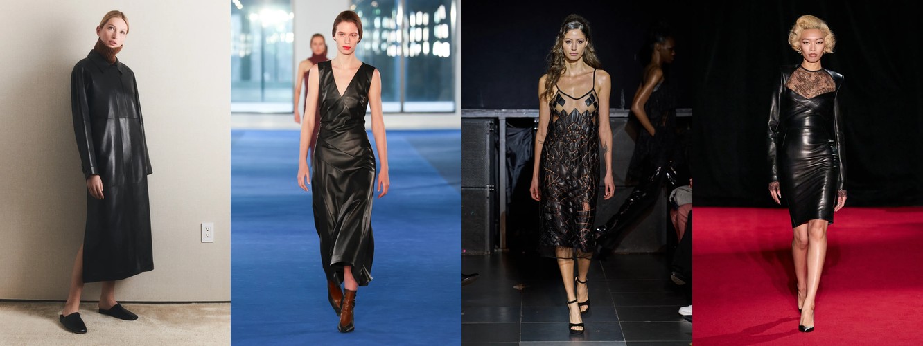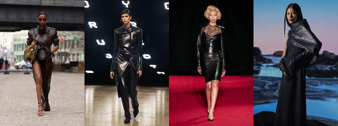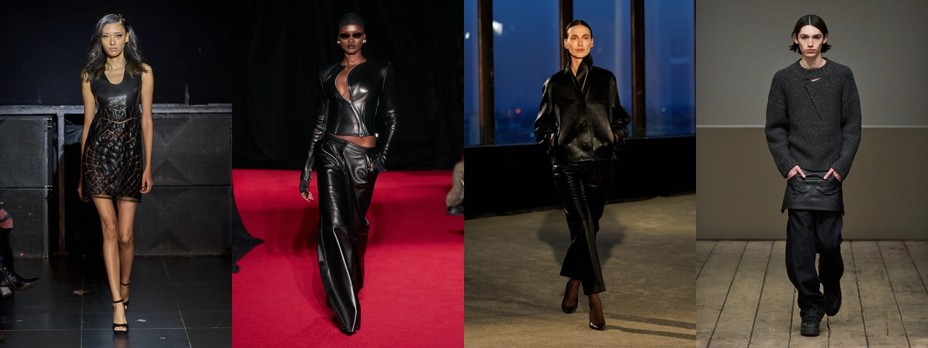 Интересно, что этот тренд не конфликтует с кожей — наоборот, кожа как категория стабильна (+5,28%), кожаный total look растёт на 6,73%, а лакированная кожа прибавляет 43,69%. Здесь нет противоречия: прозрачность и кожа — это два полюса одного и того же диалога с телом. Прозрачность обнажает, кожа обтягивает; оба отказываются от дистанции между тканью и кожей.