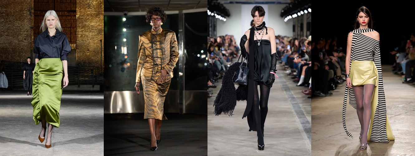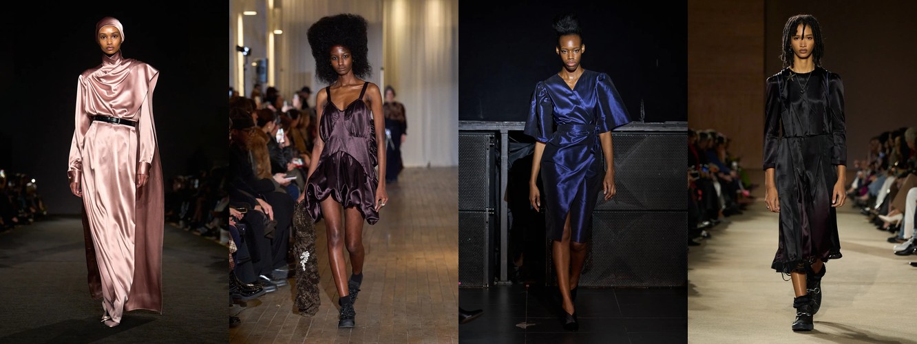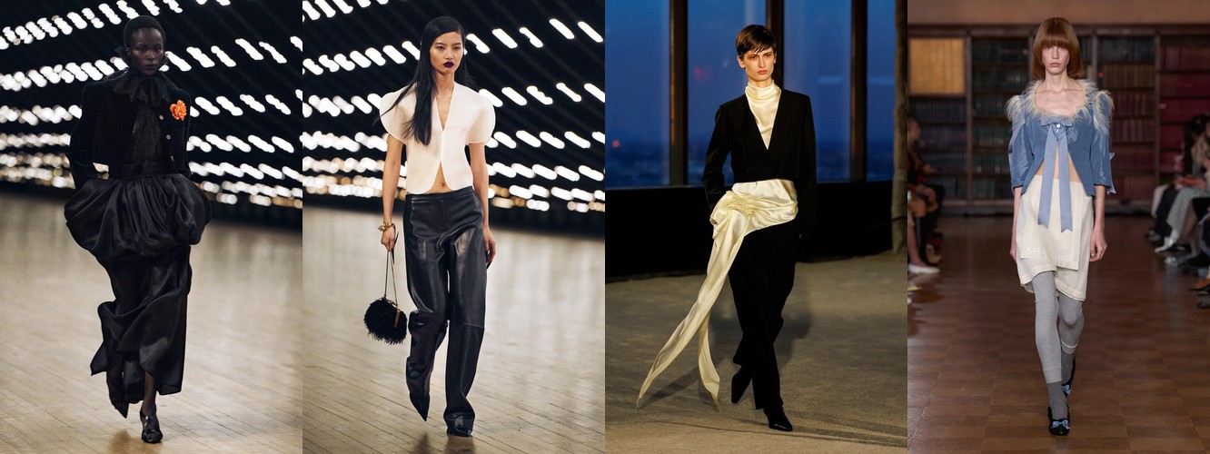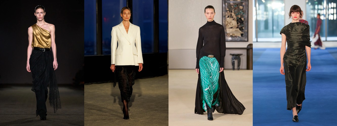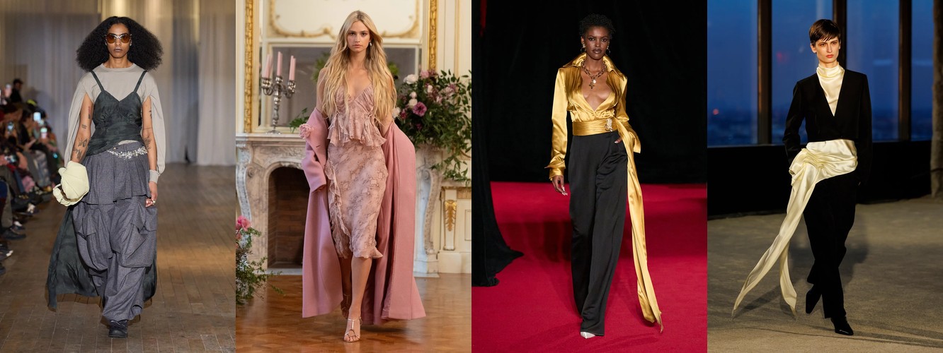 Это не означает, что женщина показов уходит из публичного пространства. Это означает, что она отказывается артикулировать свой статус через маскулинный словарь. Данные показывают: вместо блейзера и костюмных брюк приходят блузка (+28,22%), атласная юбка (+67,78%), драпировка (+13,44%), юбка с высокой талией (+26,62%). Формальность как таковая стабильна (–3,25%), но её визуальная коммуникация радикально меняется: вместо конструктивного плеча — текучий атлас; вместо прямоугольного силуэта — мягкий объём драпировки.