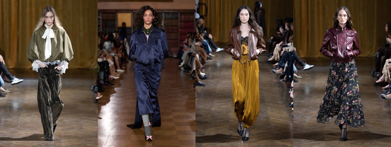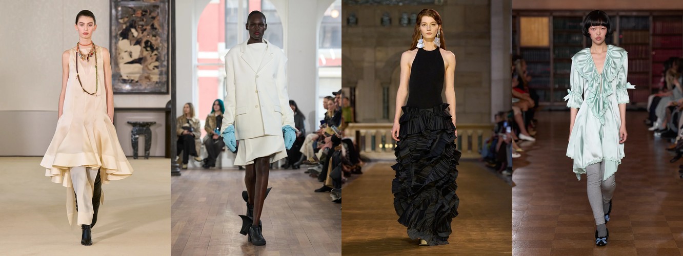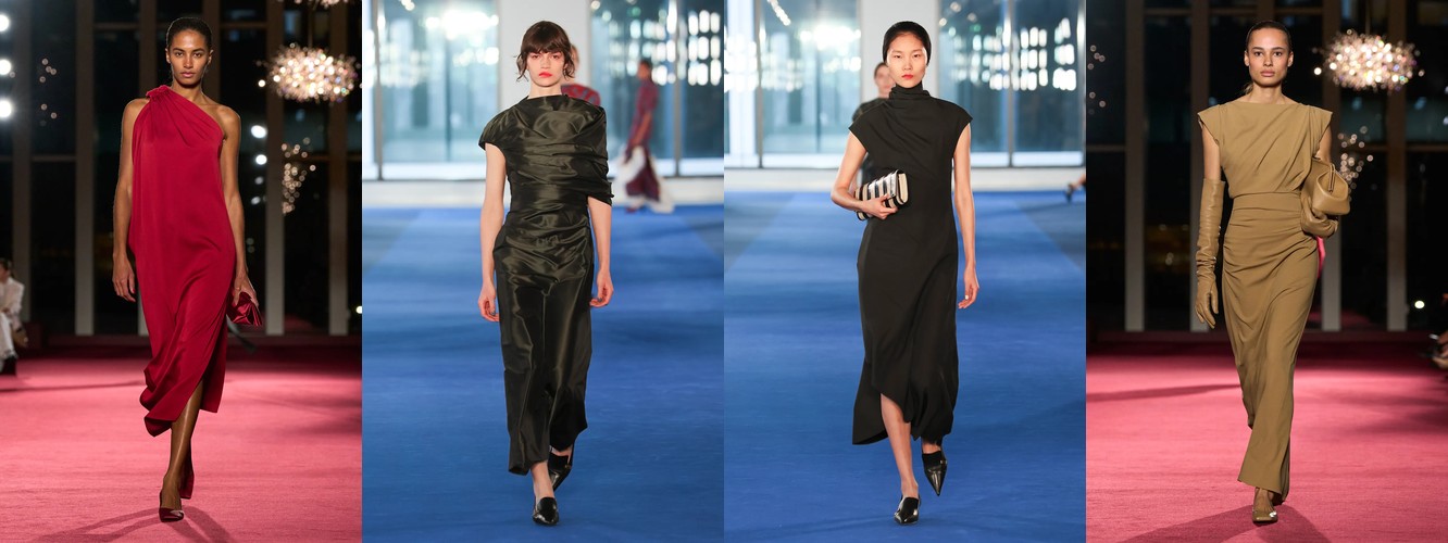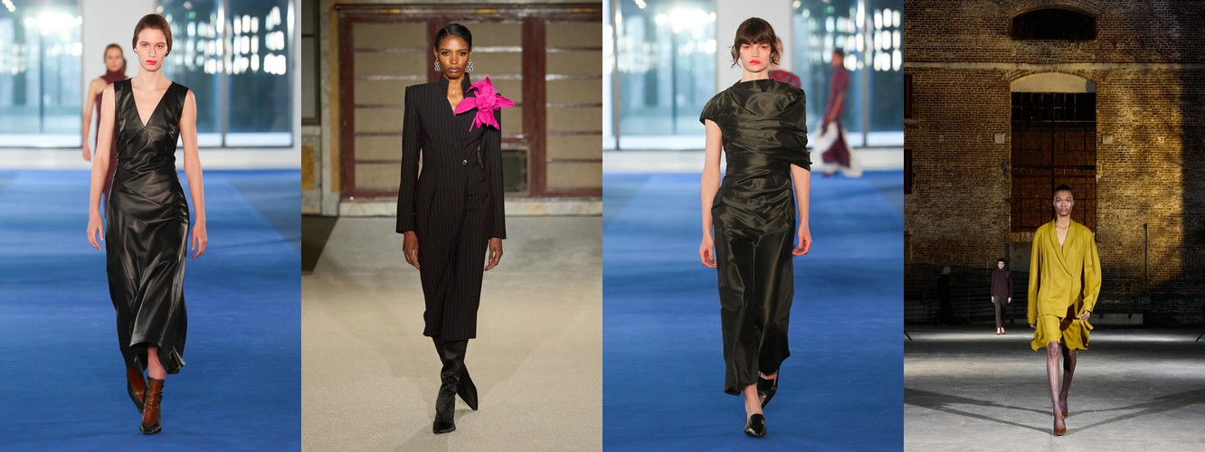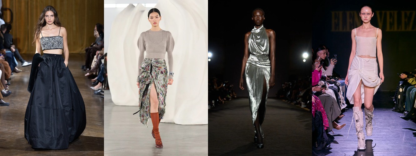 Это не означает, что женщина показов уходит из публичного пространства. Это означает, что она отказывается артикулировать свой статус через маскулинный словарь. Данные показывают: вместо блейзера и костюмных брюк приходят блузка (+28,22%), атласная юбка (+67,78%), драпировка (+13,44%), юбка с высокой талией (+26,62%). Формальность как таковая стабильна (–3,25%), но её визуальная коммуникация радикально меняется: вместо конструктивного плеча — текучий атлас; вместо прямоугольного силуэта — мягкий объём драпировки.