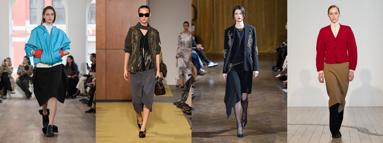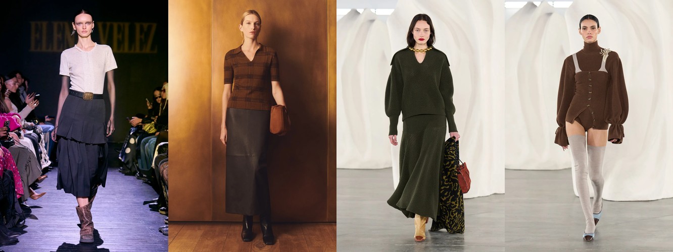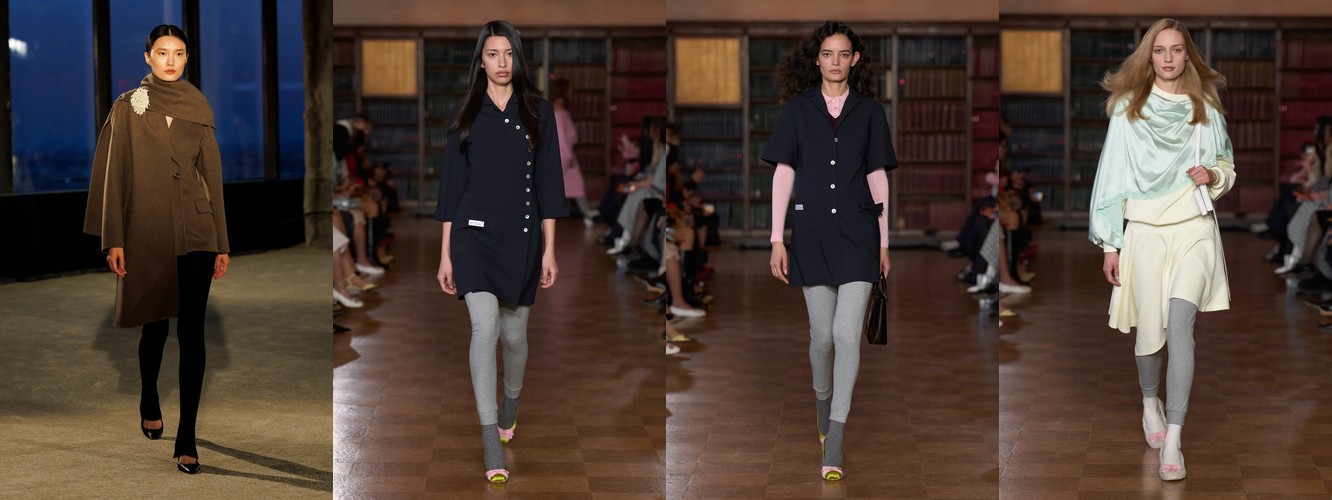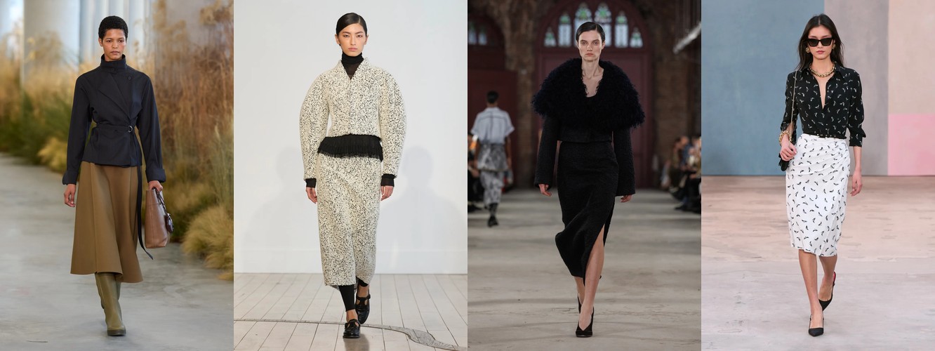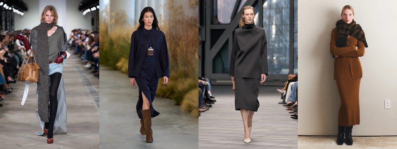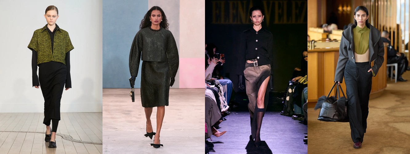 Это перестройка пропорций: линия талии поднимается, верхняя одежда укорачивается, ноги открываются. В сочетании с ростом юбок всех длин (включая мини +18,07%) и подъёмом колготок как стайлинг-элемента (+228,89%) вырисовывается новая архитектура лука: укороченная куртка или косуха + юбка + видимые колготки. Это силуэт, который строится вокруг ноги, а не вокруг плеча — принципиальный отход от пост-пандемийного силуэта «широкое-сверху-широкое-снизу».