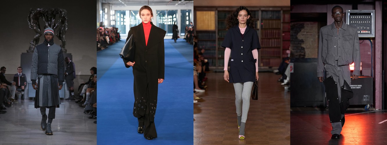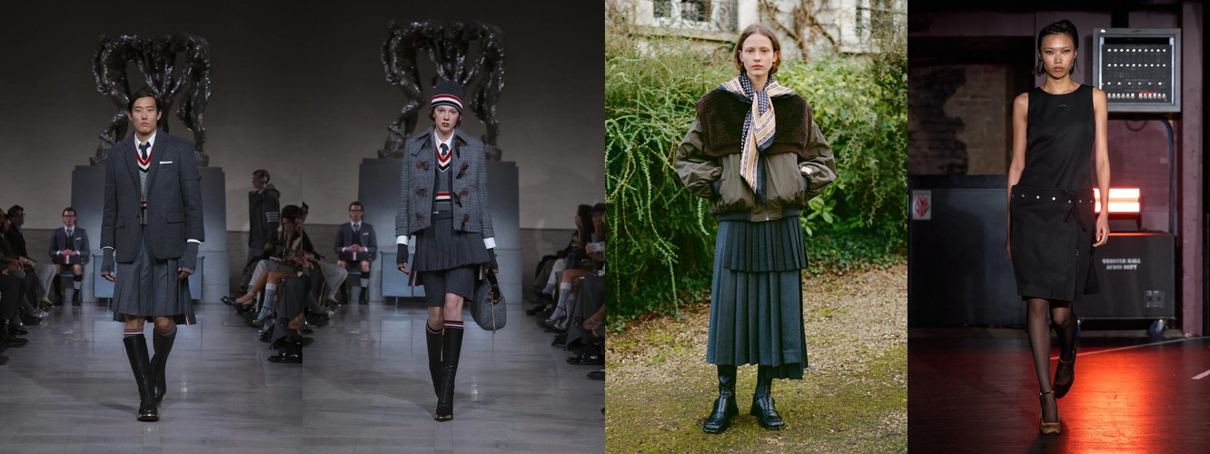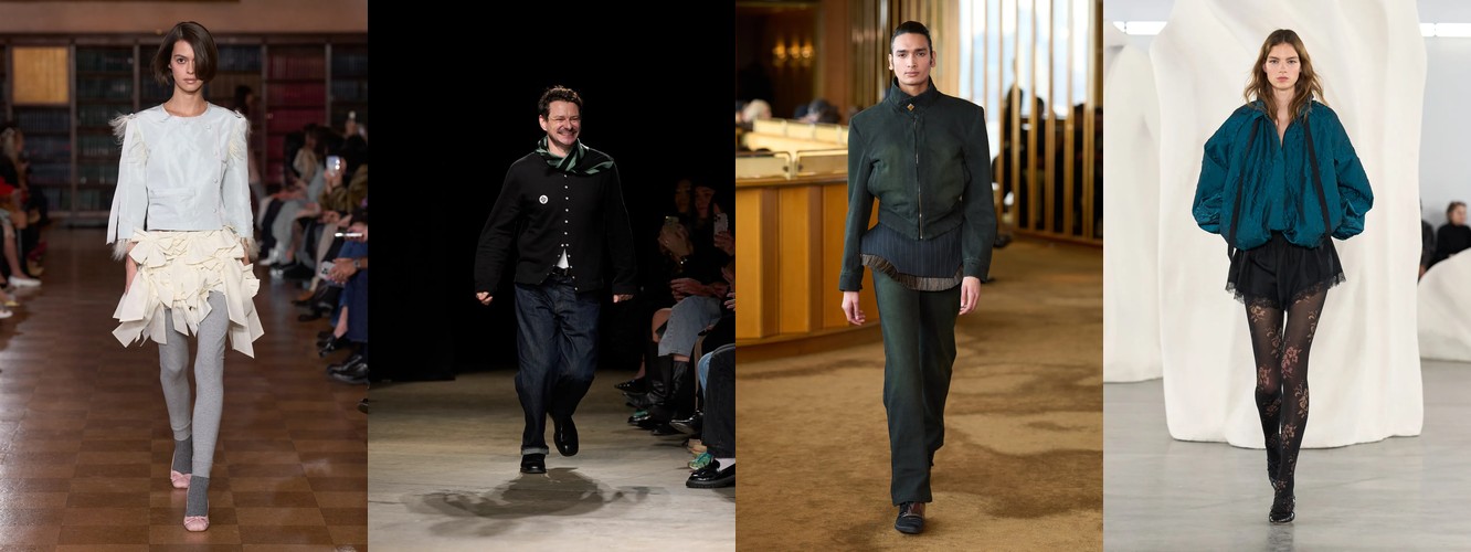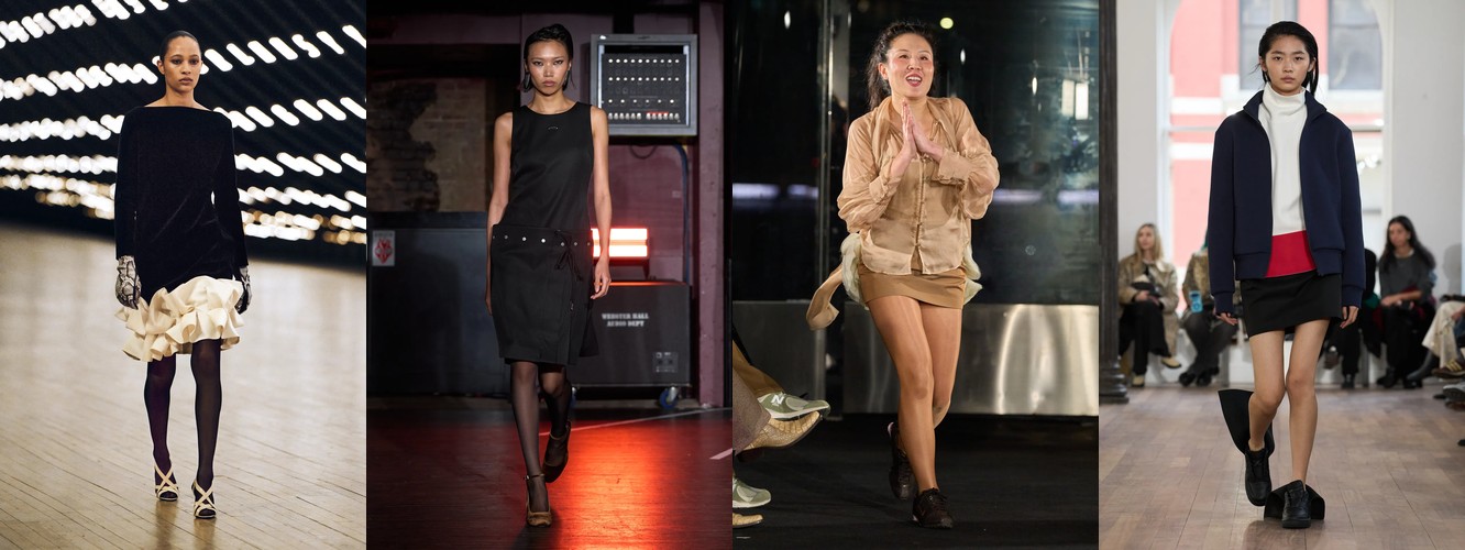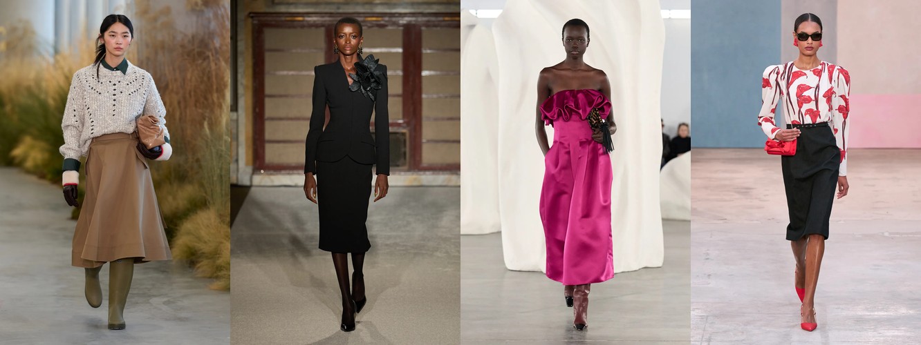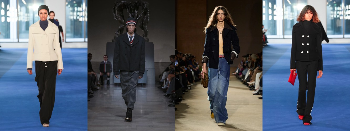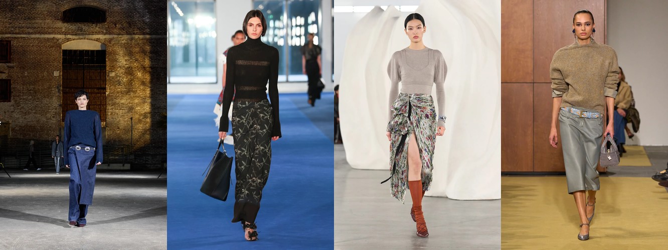 Это перестройка пропорций: линия талии поднимается, верхняя одежда укорачивается, ноги открываются. В сочетании с ростом юбок всех длин (включая мини +18,07%) и подъёмом колготок как стайлинг-элемента (+228,89%) вырисовывается новая архитектура лука: укороченная куртка или косуха + юбка + видимые колготки. Это силуэт, который строится вокруг ноги, а не вокруг плеча — принципиальный отход от пост-пандемийного силуэта «широкое-сверху-широкое-снизу».