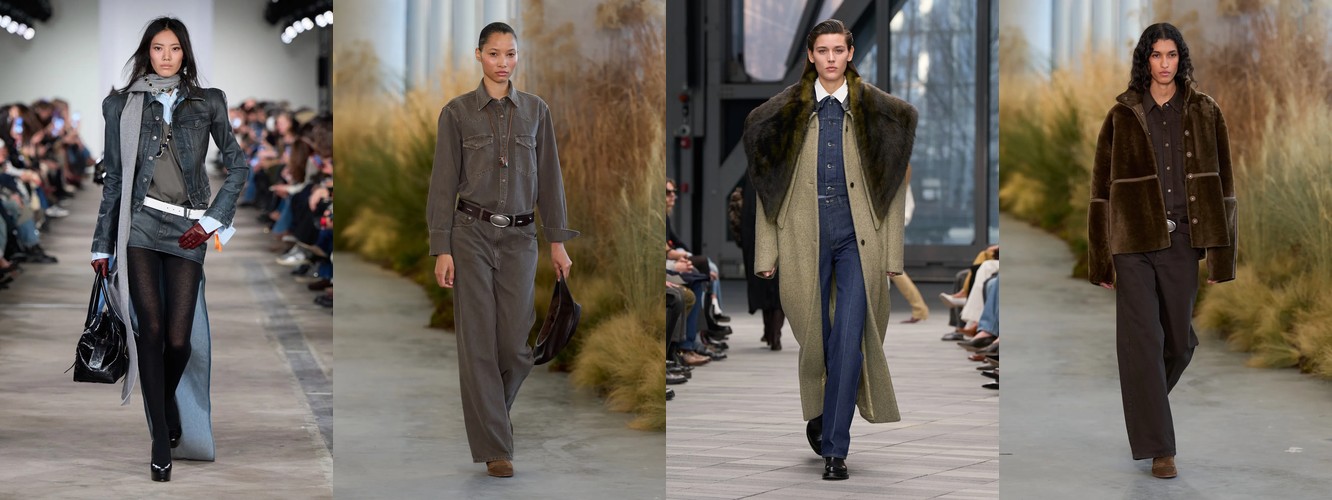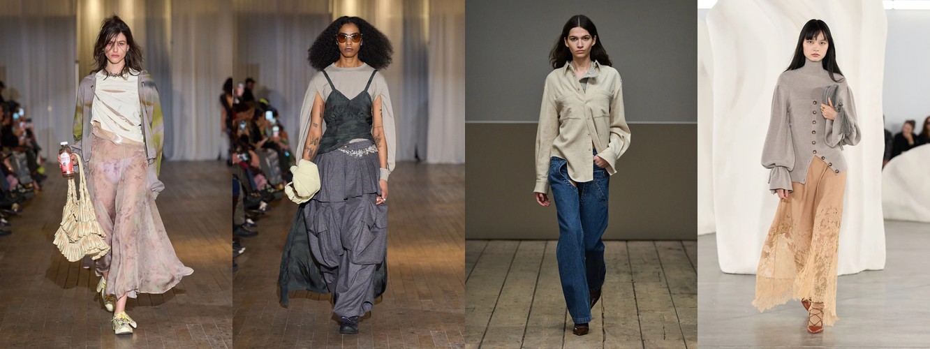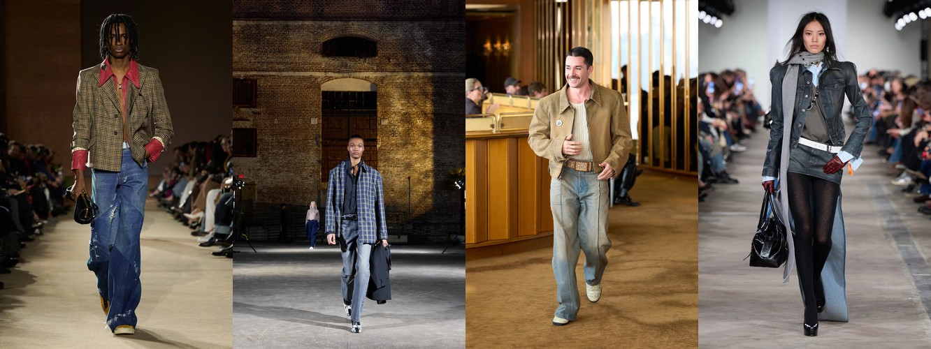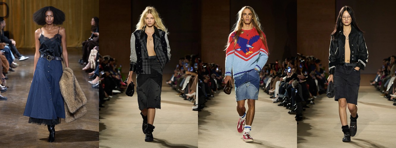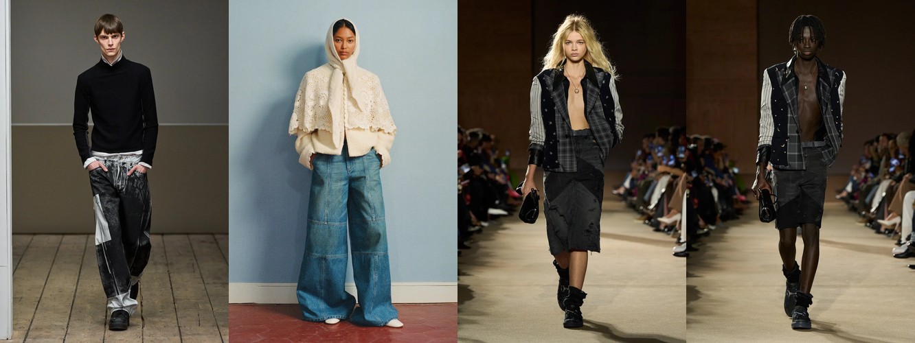 Деним перестаёт быть «демократичной базой» и становится полем для экспрессии и субкультурной маркировки. Ламинирование, потёртость, рваная текстура, перенос в юбочный формат — всё это признаки того, что дизайнеры используют деним как материал для трансгрессии, а не комфорта. В сочетании с ростом тегов «гранж» (+78,31%) и падением «преппи» (–48,55%) это формирует отчётливый вектор: от «хорошей девочки» к «плохой девочке», от Ральфа Лорена к Вивьен Вествуд.