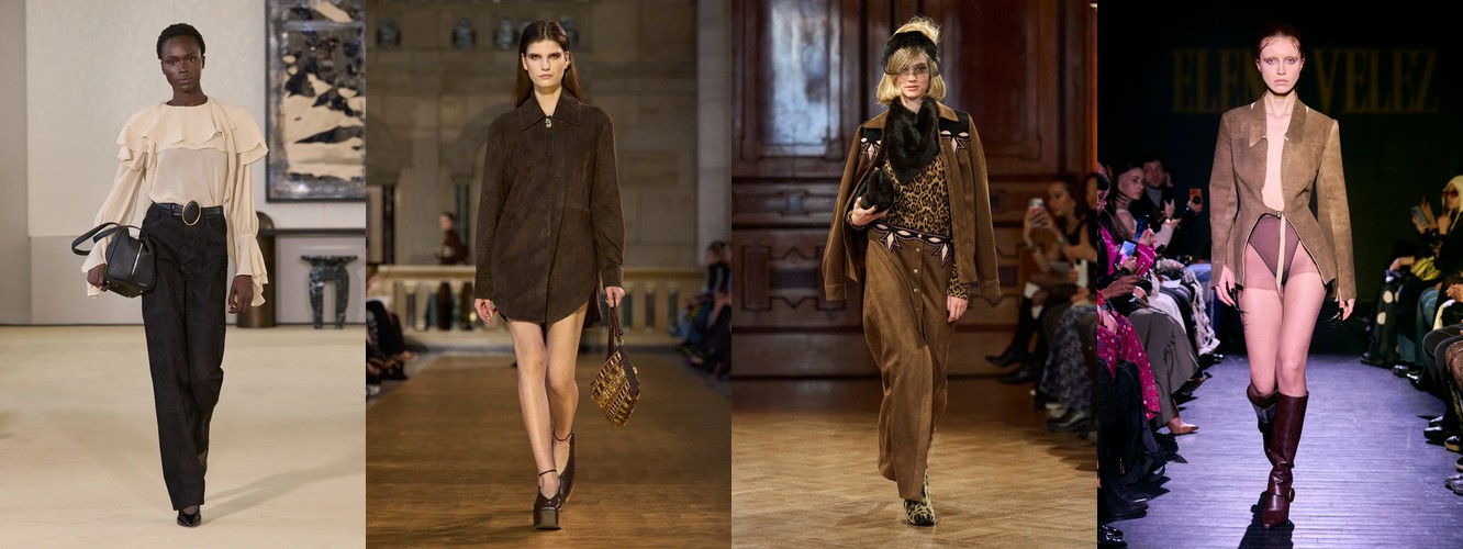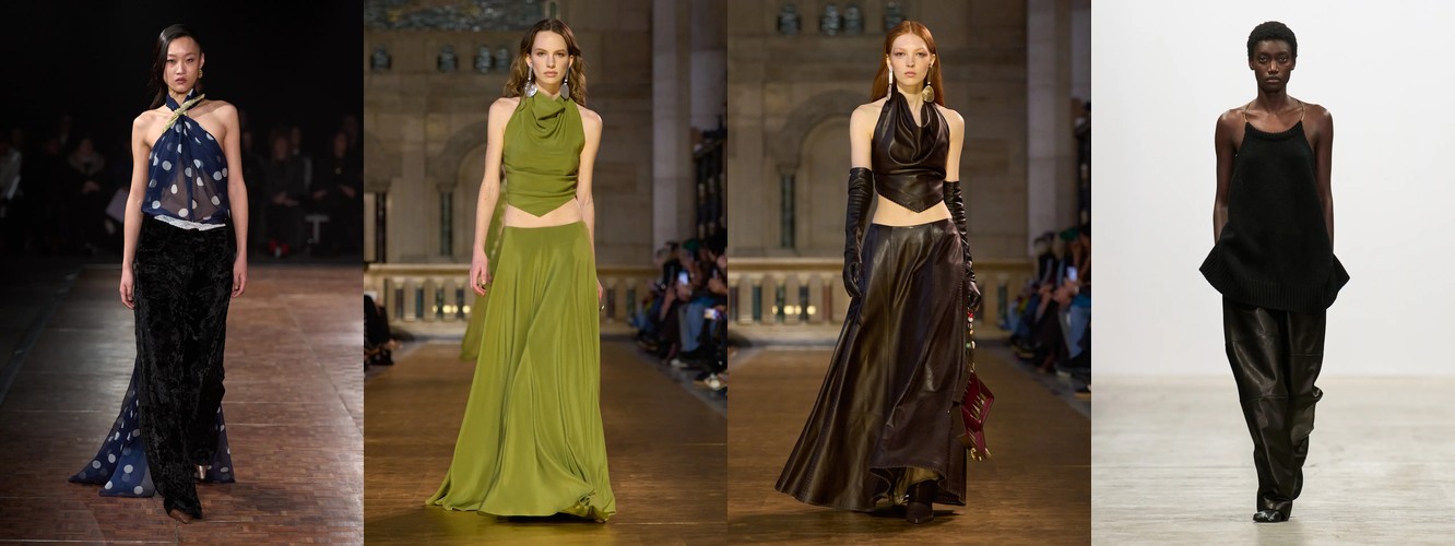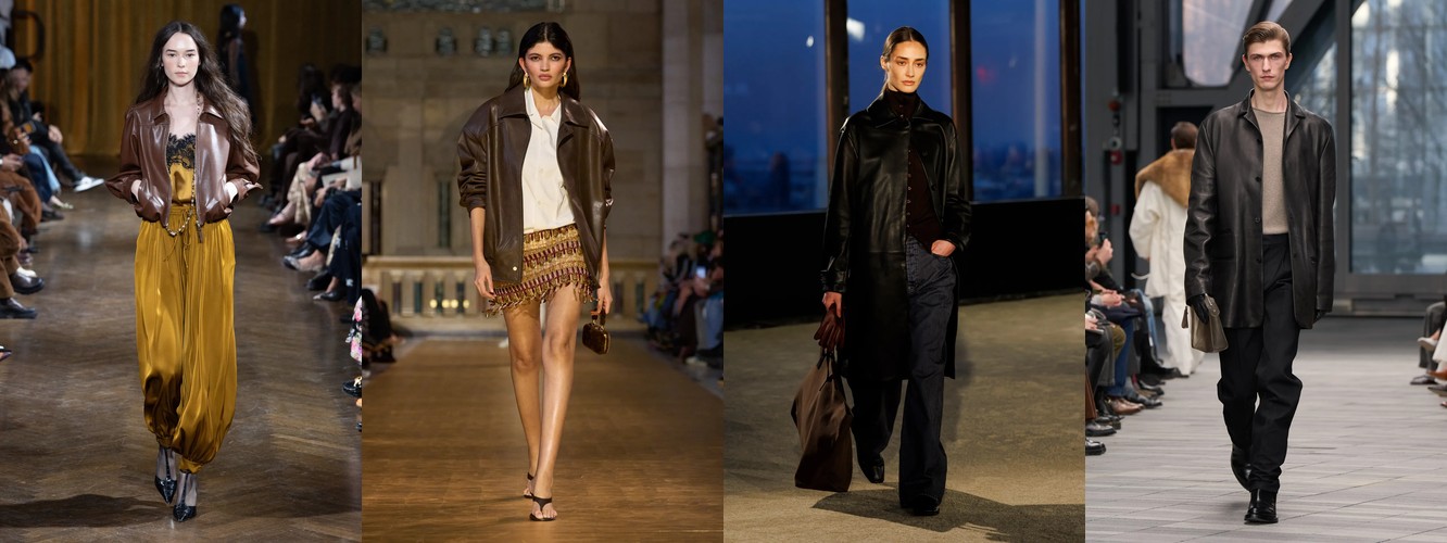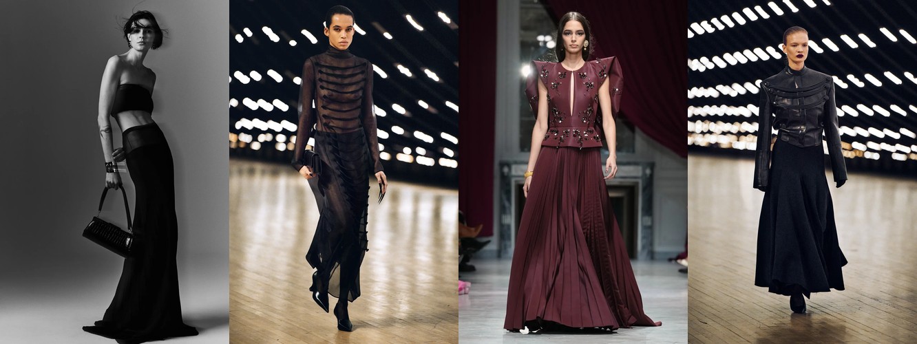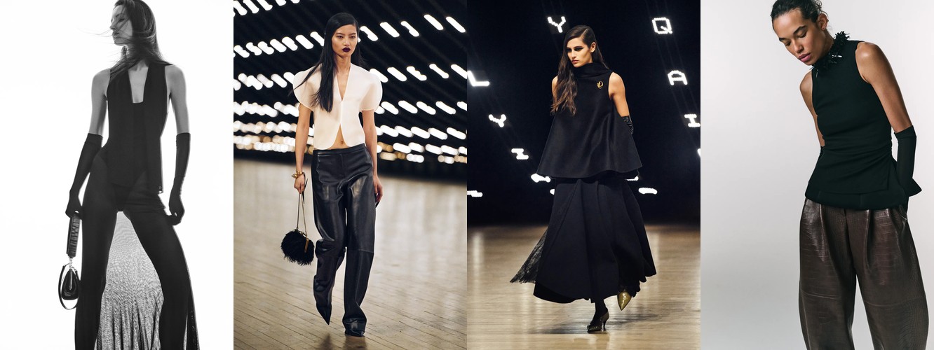 Героиня осени-зимы 26–27 радикально иная. Она носит косуху или укороченное пальто с бархатной юбкой, корсет или камисоль под кожаным жакетом, атласную юбку-карандаш с прозрачным топом, меховой воротник поверх бюстье. Её палитра — чёрный, глубокий морской синий, тёплый коричневый. Она выбирает бархат, лакированную кожу, перья, сетку. Её социальная роль — не «профессионал», а «протагонист»; её эмоциональное сообщение — «я осознанно выбираю открытость».